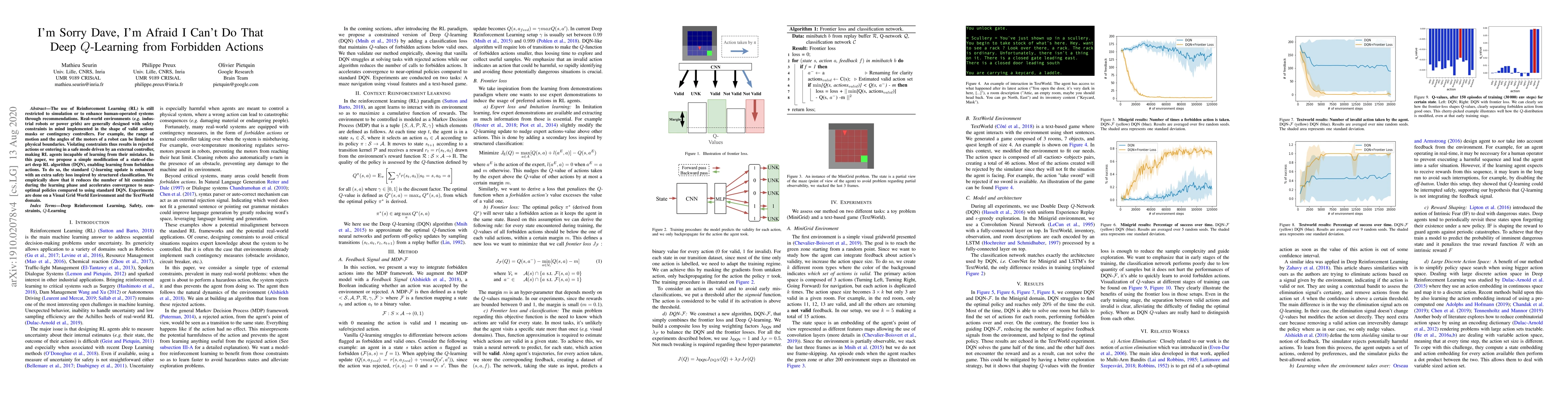 The paper introduces a frontier loss combined with a classification network to guide Deep Q-learning in handling forbidden actions, effectively reducing constraint violations and improving learning efficiency.