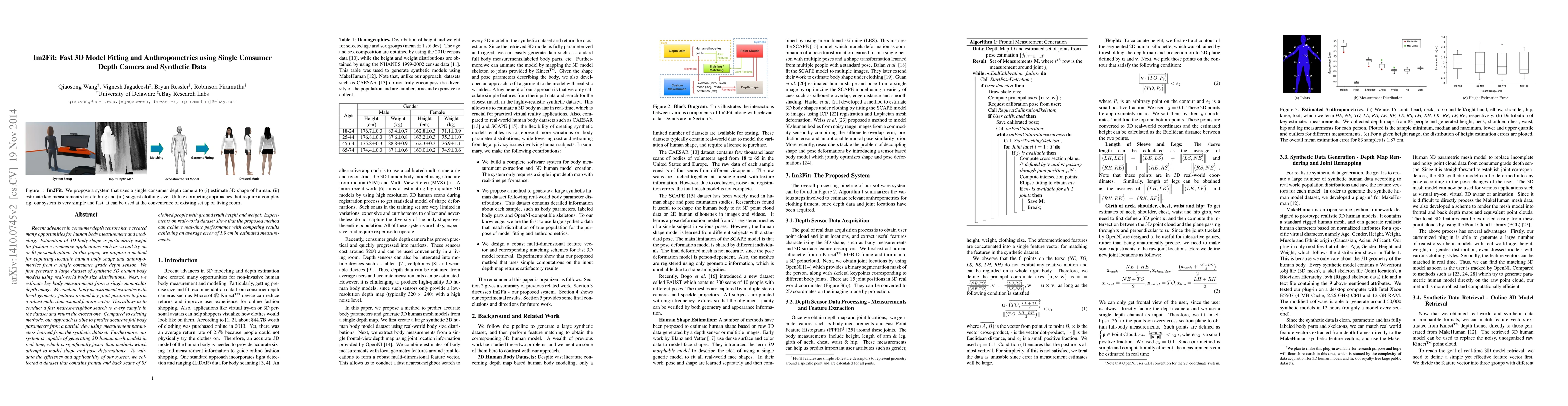 Recent advances in consumer depth sensors have created many opportunities for human body measurement and modeling. Estimation of 3D body shape is particularly useful for fashion e-commerce applications such as virtual try-on or fit personalization. In this paper, we propose a method for capturing accurate human body shape and anthropometrics from a single consumer grade depth sensor. We first generate a large dataset of synthetic 3D human body models using real-world body size distributions. Next, we estimate key body measurements from a single monocular depth image. We combine body measurement estimates with local geometry features around key joint positions to form a robust multi-dimensional feature vector. This allows us to conduct a fast nearest-neighbor search to every sample in the dataset and return the closest one. Compared to existing methods, our approach is able to predict accurate full body parameters from a partial view using measurement parameters learned from the synthetic dataset. Furthermore, our system is capable of generating 3D human mesh models in real-time, which is significantly faster than methods which attempt to model shape and pose deformations. To validate the efficiency and applicability of our system, we collected a dataset that contains frontal and back scans of 83 clothed people with ground truth height and weight. Experiments on real-world dataset show that the proposed method can achieve real-time performance with competing results achieving an average error of 1.9 cm in estimated measurements.