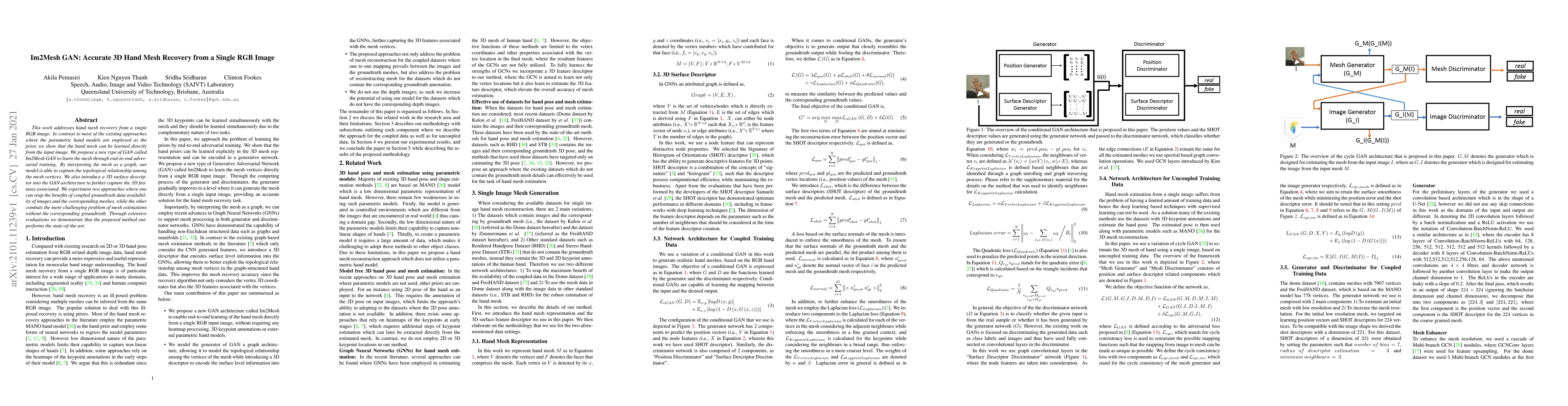 This paper proposes Im2Mesh GAN, a novel GAN for accurate 3D hand mesh recovery from a single RGB image, learning the mesh directly from the input without relying on parametric hand models. The method captures topological relationships and 3D features through adversarial training and a 3D surface descriptor, outperforming existing approaches.