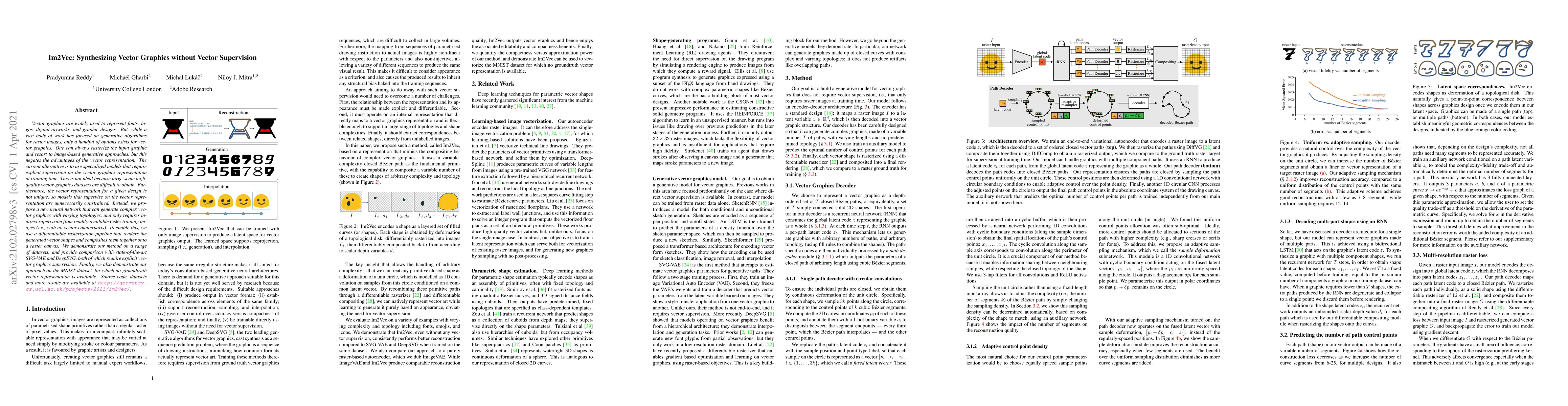 Vector graphics are widely used to represent fonts, logos, digital artworks, and graphic designs. But, while a vast body of work has focused on generative algorithms for raster images, only a handful of options exists for vector graphics. One can always rasterize the input graphic and resort to image-based generative approaches, but this negates the advantages of the vector representation. The current alternative is to use specialized models that require explicit supervision on the vector graphics representation at training time. This is not ideal because large-scale high quality vector-graphics datasets are difficult to obtain. Furthermore, the vector representation for a given design is not unique, so models that supervise on the vector representation are unnecessarily constrained. Instead, we propose a new neural network that can generate complex vector graphics with varying topologies, and only requires indirect supervision from readily-available raster training images (i.e., with no vector counterparts). To enable this, we use a differentiable rasterization pipeline that renders the generated vector shapes and composites them together onto a raster canvas. We demonstrate our method on a range of datasets, and provide comparison with state-of-the-art SVG-VAE and DeepSVG, both of which require explicit vector graphics supervision. Finally, we also demonstrate our approach on the MNIST dataset, for which no groundtruth vector representation is available. Source code, datasets, and more results are available at geometry.cs.ucl.ac.uk/projects/2021/Im2Vec/