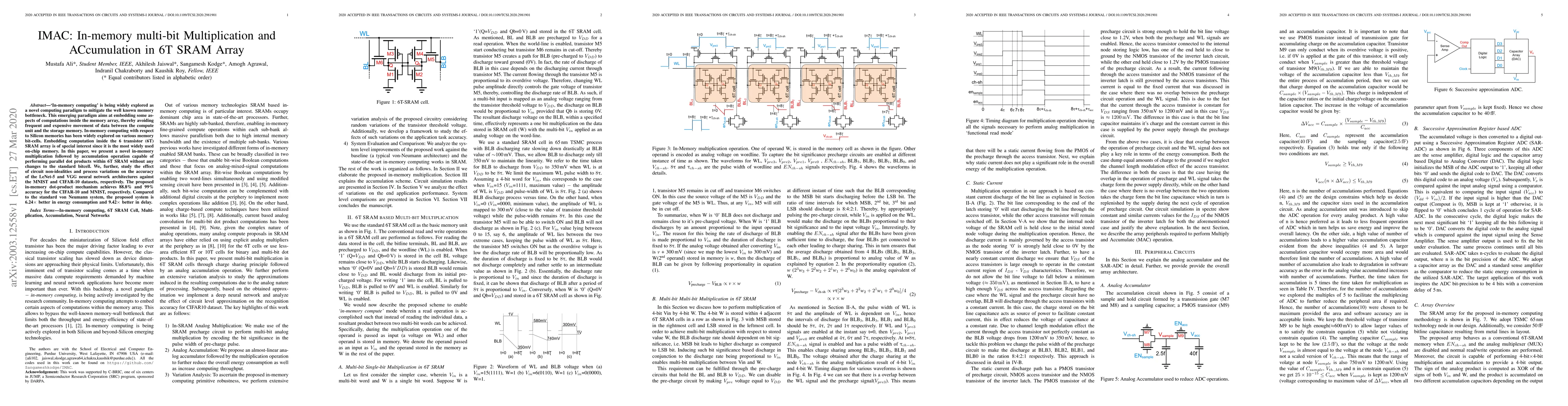 `In-memory computing' is being widely explored as a novel computing paradigm to mitigate the well known memory bottleneck. This emerging paradigm aims at embedding some aspects of computations inside the memory array, thereby avoiding frequent and expensive movement of data between the compute unit and the storage memory. In-memory computing with respect to Silicon memories has been widely explored on various memory bit-cells. Embedding computation inside the 6 transistor (6T) SRAM array is of special interest since it is the most widely used on-chip memory. In this paper, we present a novel in-memory multiplication followed by accumulation operation capable of performing parallel dot products within 6T SRAM without any changes to the standard bitcell. We, further, study the effect of circuit non-idealities and process variations on the accuracy of the LeNet-5 and VGG neural network architectures against the MNIST and CIFAR-10 datasets, respectively. The proposed in-memory dot-product mechanism achieves 88.8% and 99% accuracy for the CIFAR-10 and MNIST, respectively. Compared to the standard von Neumann system, the proposed system is 6.24x better in energy consumption and 9.42x better in delay.