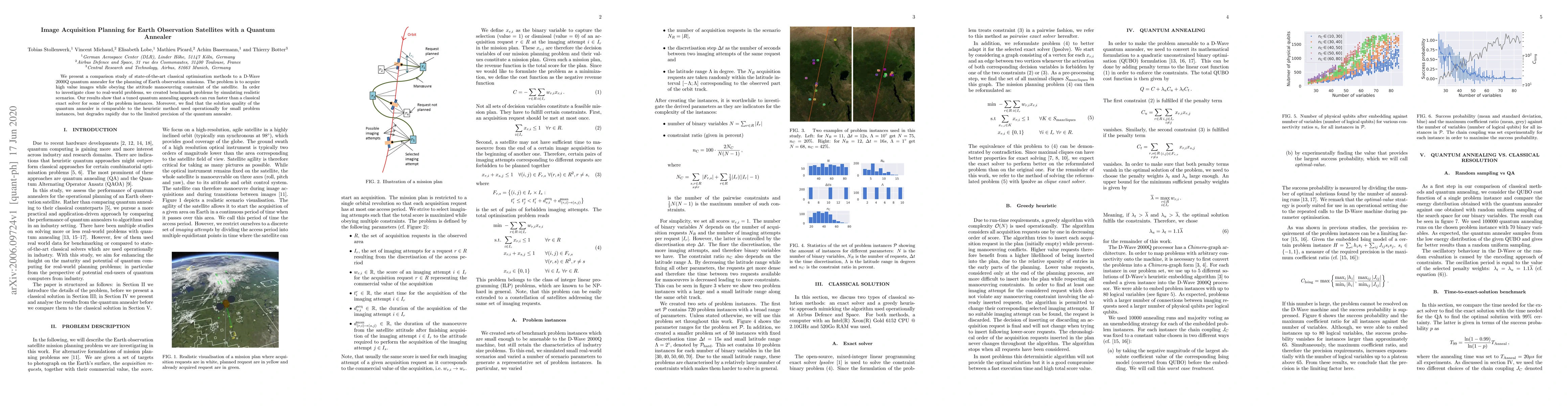 This study compares classical optimization methods with a D-Wave 2000Q quantum annealer for planning Earth observation satellite missions, aiming to acquire high-value images while adhering to satellite constraints. The quantum annealer outperforms classical solvers in speed for some instances but struggles with precision, yielding comparable solution quality to heuristics for small problems but degrading rapidly.