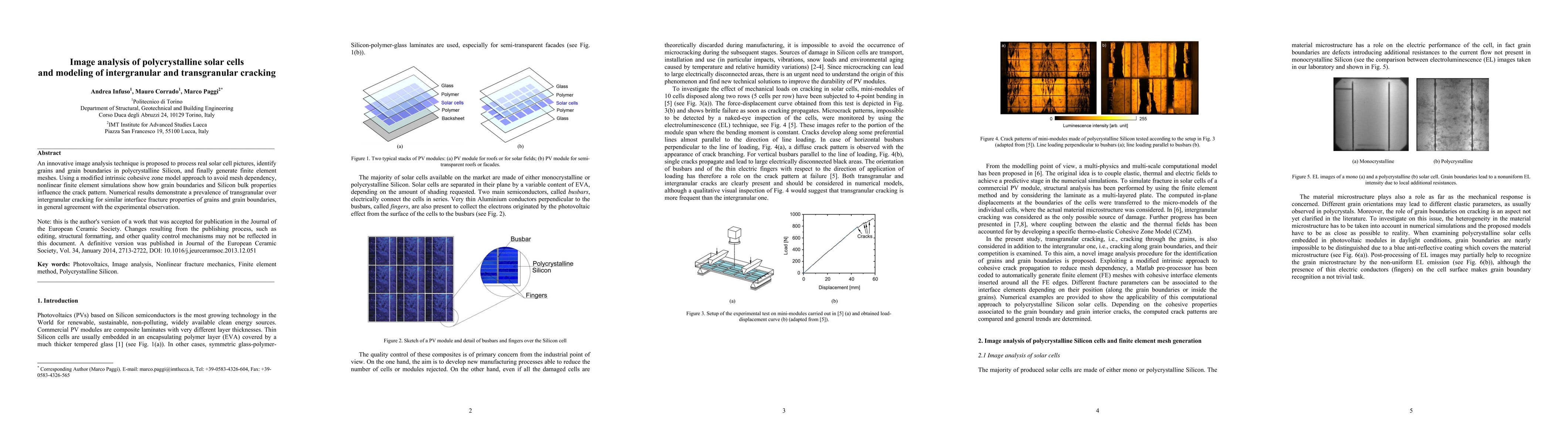 This paper proposes an image analysis technique to identify grains and grain boundaries in polycrystalline silicon solar cells, generating finite element meshes. It uses a modified cohesive zone model to simulate crack patterns, showing that transgranular cracking is more prevalent than intergranular cracking, aligning with experimental observations.