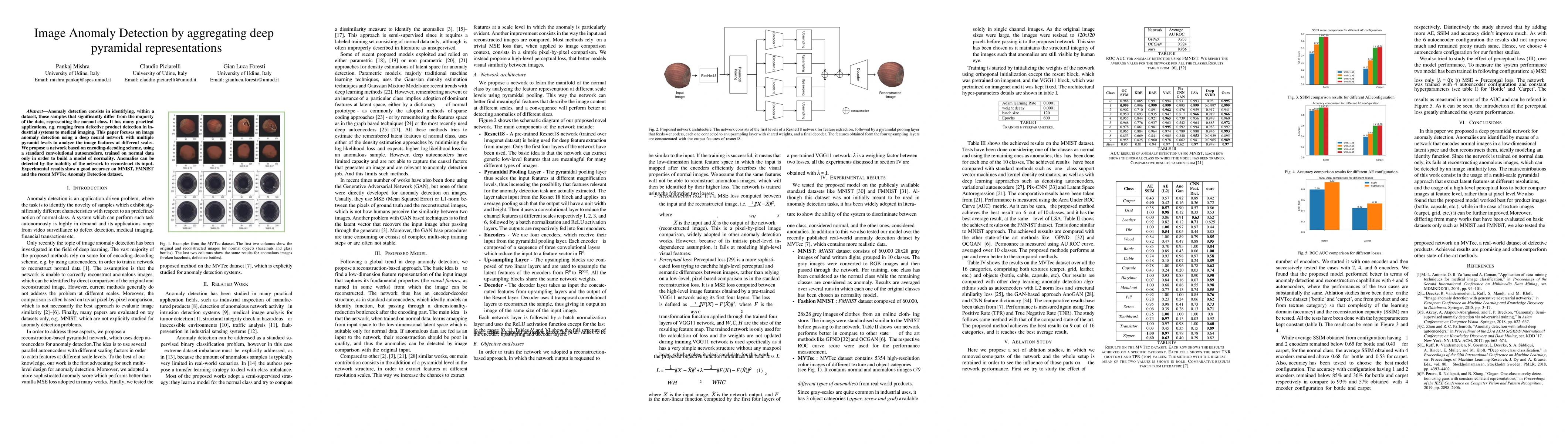 This paper proposes a deep neural network model that detects image anomalies by analyzing features at different scales using a pyramid structure, achieving good accuracy on MNIST, FMNIST, and MVTec datasets.