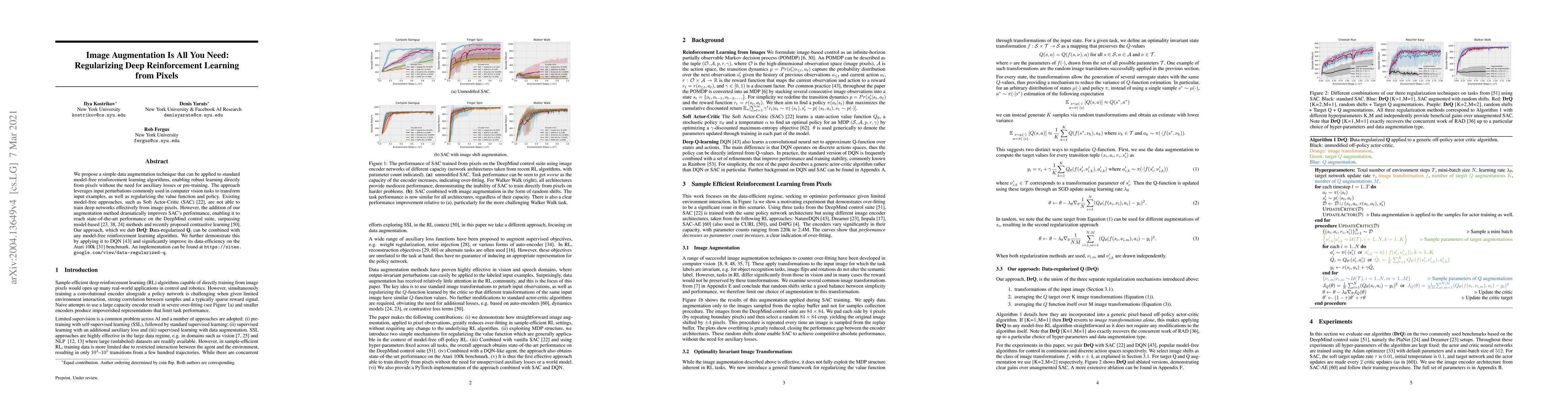 We propose a simple data augmentation technique that can be applied to standard model-free reinforcement learning algorithms, enabling robust learning directly from pixels without the need for auxiliary losses or pre-training. The approach leverages input perturbations commonly used in computer vision tasks to regularize the value function. Existing model-free approaches, such as Soft Actor-Critic (SAC), are not able to train deep networks effectively from image pixels. However, the addition of our augmentation method dramatically improves SAC's performance, enabling it to reach state-of-the-art performance on the DeepMind control suite, surpassing model-based (Dreamer, PlaNet, and SLAC) methods and recently proposed contrastive learning (CURL). Our approach can be combined with any model-free reinforcement learning algorithm, requiring only minor modifications. An implementation can be found at https://sites.google.com/view/data-regularized-q.