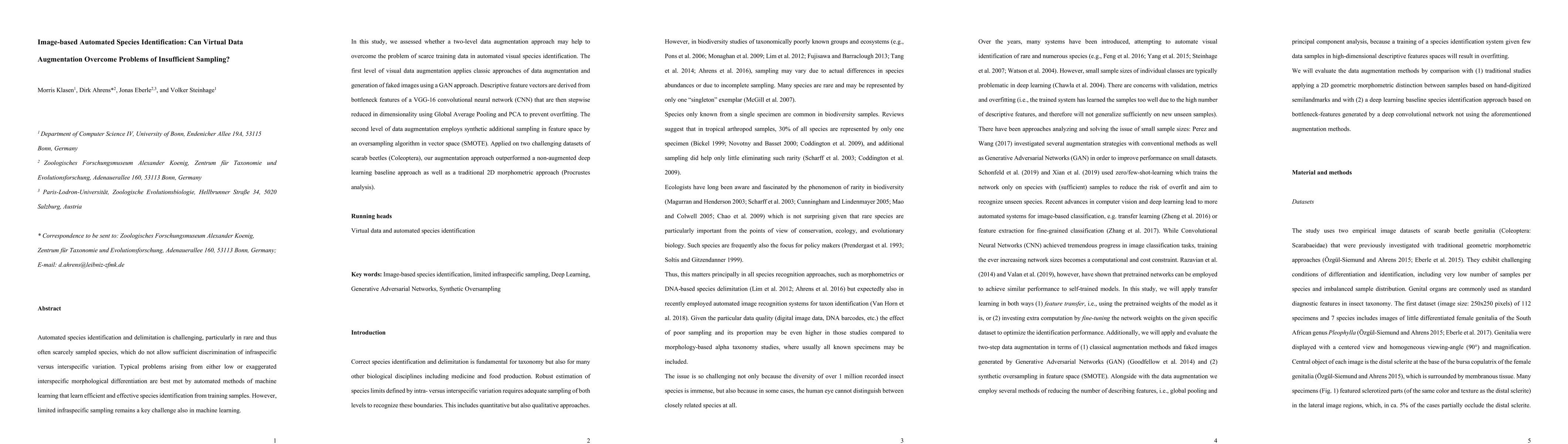 This research investigates the use of virtual data augmentation techniques to improve automated species identification, particularly for rare species with limited sampling. The study employs a two-level data augmentation method, combining classic data augmentation, GAN-generated images, and synthetic sampling in feature space, to enhance training data for a convolutional neural network. The results show that this approach outperforms both non-augmented deep learning and traditional morphometric methods on datasets of scarab beetles.