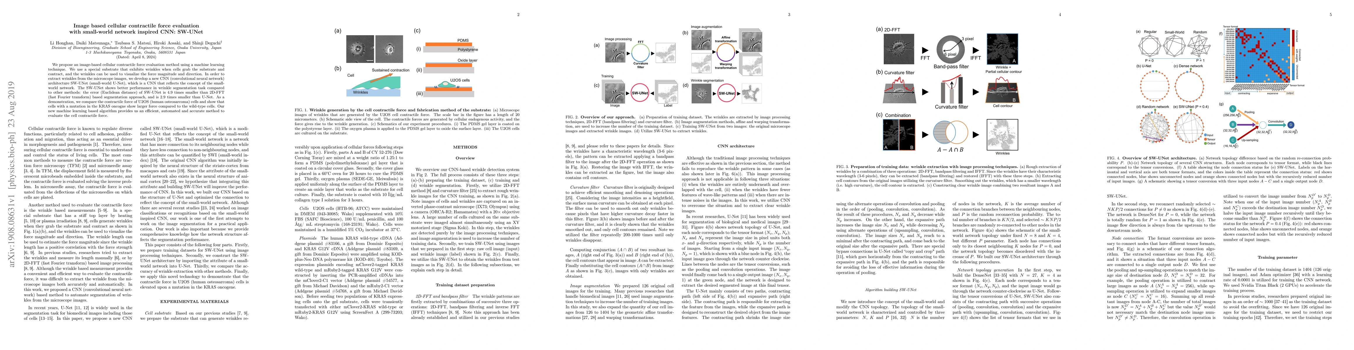 We propose an image-based cellular contractile force evaluation method using a machine learning technique. We use a special substrate that exhibits wrinkles when cells grab the substrate and contract, and the wrinkles can be used to visualize the force magnitude and direction. In order to extract wrinkles from the microscope images, we develop a new CNN (convolutional neural network) architecture SW-UNet (small-world U-Net), which is a CNN that reflects the concept of the small-world network. The SW-UNet shows better performance in wrinkle segmentation task compared to other methods: the error (Euclidean distance) of SW-UNet is 4.9 times smaller than 2D-FFT (fast Fourier transform) based segmentation approach, and is 2.9 times smaller than U-Net. As a demonstration, we compare the contractile force of U2OS (human osteosarcoma) cells and show that cells with a mutation in the KRAS oncogne show larger force compared to the wild-type cells. Our new machine learning based algorithm provides us an efficient, automated and accurate method to evaluate the cell contractile force.