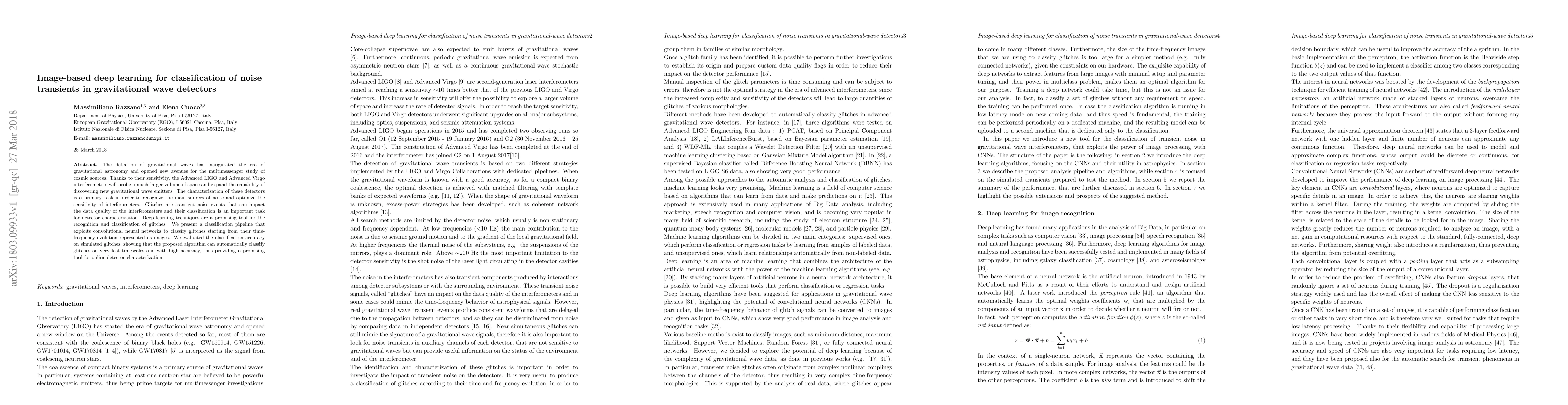 This paper proposes a convolutional neural network-based deep learning approach to classify noise transients, or glitches, in gravitational wave detectors using their time-frequency evolution images. The method demonstrates high accuracy in classifying simulated glitches, offering a promising tool for real-time detector characterization.