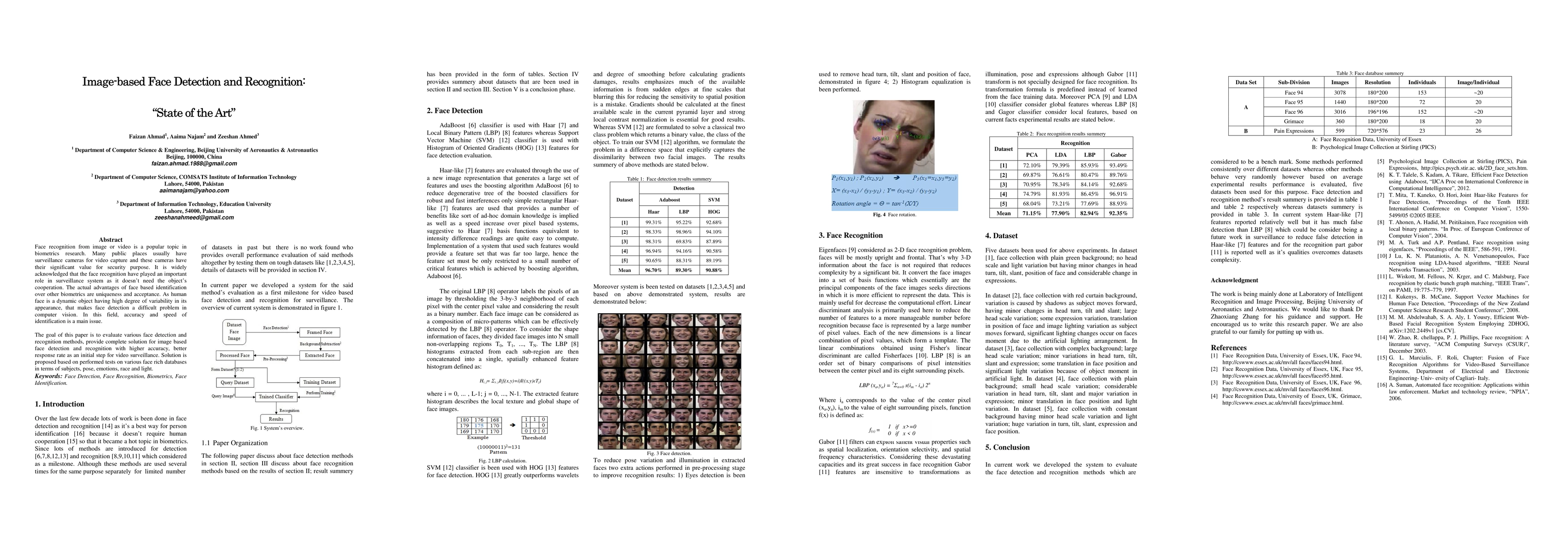 This paper evaluates various face detection and recognition methods, aiming to provide a comprehensive solution for image-based face detection and recognition with higher accuracy and better response rates, particularly for video surveillance applications. The proposed solution is tested on diverse face-rich databases considering factors like subjects, pose, emotions, race, and lighting conditions.