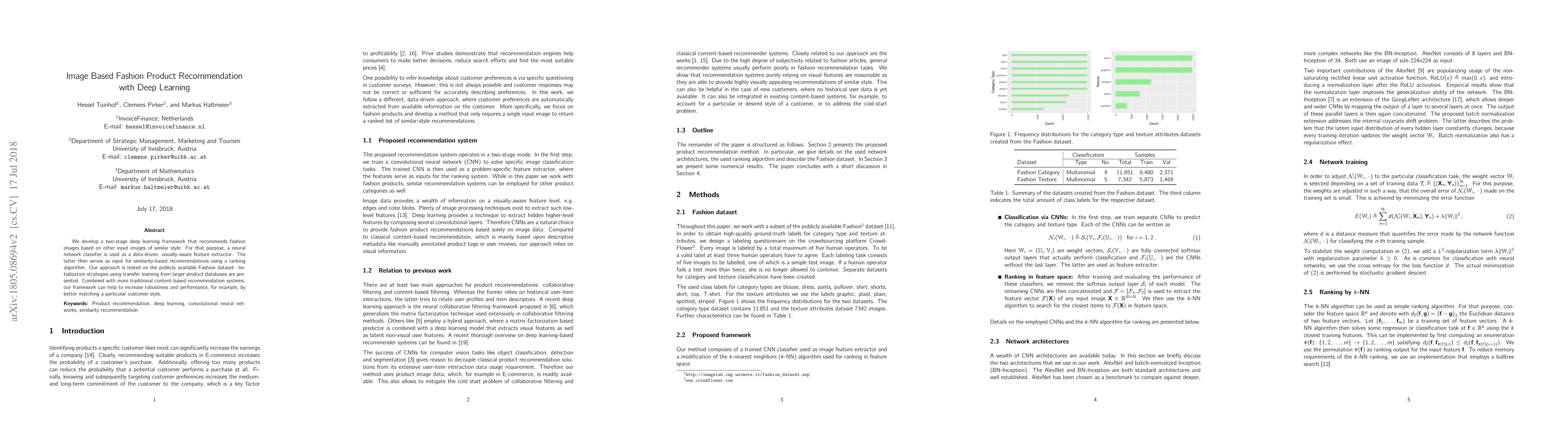 This paper proposes a deep learning framework for fashion product recommendations based on image similarity, utilizing a neural network classifier for feature extraction and a ranking algorithm for recommendations. The method is tested on the Fashion dataset, and transfer learning strategies are explored to enhance performance.