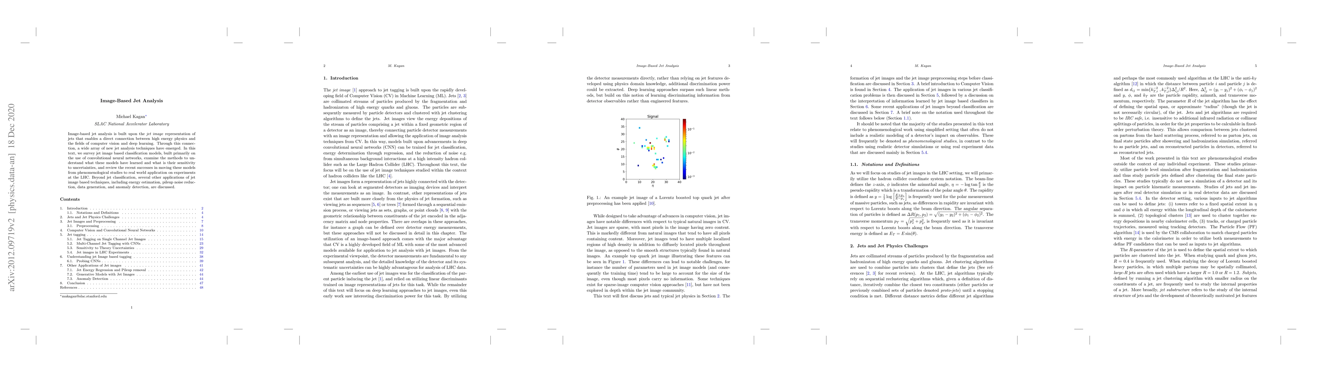 Image-based jet analysis is built upon the jet image representation of jets that enables a direct connection between high energy physics and the fields of computer vision and deep learning. Through this connection, a wide array of new jet analysis techniques have emerged. In this text, we survey jet image based classification models, built primarily on the use of convolutional neural networks, examine the methods to understand what these models have learned and what is their sensitivity to uncertainties, and review the recent successes in moving these models from phenomenological studies to real world application on experiments at the LHC. Beyond jet classification, several other applications of jet image based techniques, including energy estimation, pileup noise reduction, data generation, and anomaly detection, are discussed.