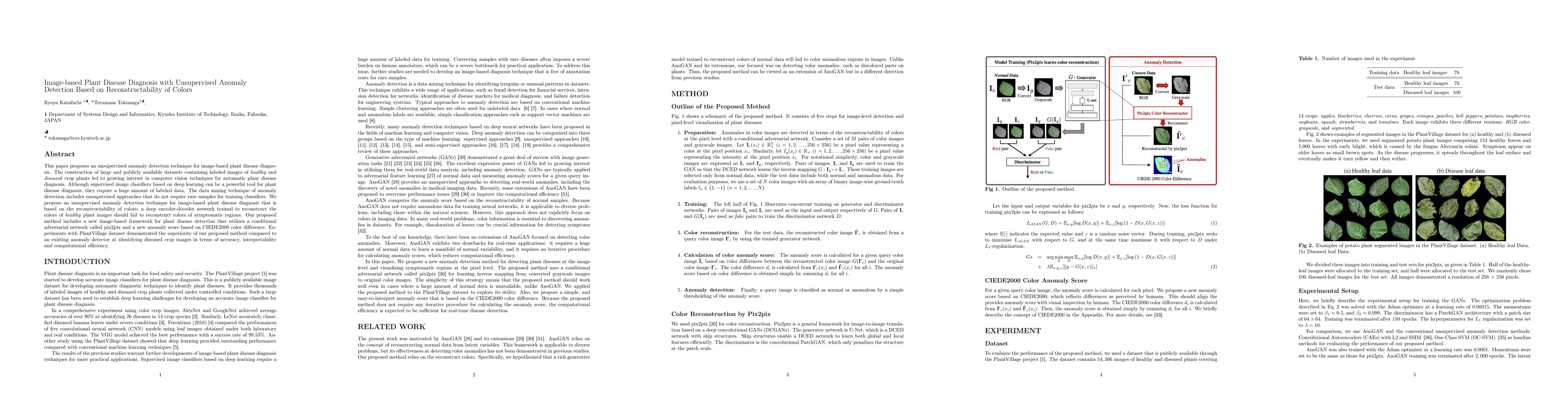 This paper introduces an unsupervised anomaly detection method for diagnosing plant diseases using color reconstructability, leveraging a deep encoder-decoder network and a conditional adversarial network. Experiments show its effectiveness over existing methods in accuracy, interpretability, and computational efficiency.