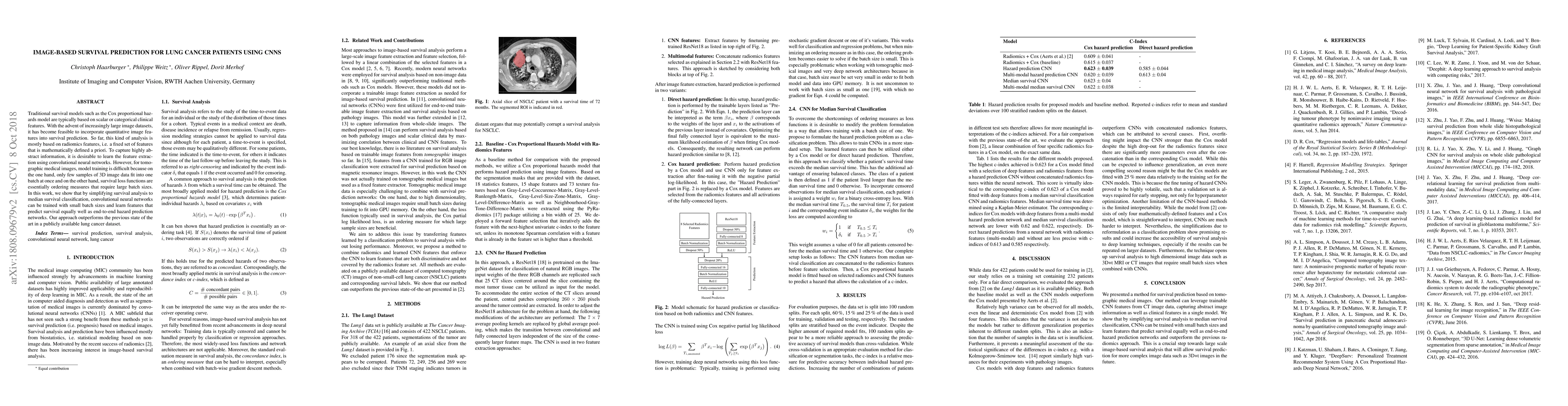 This paper proposes using convolutional neural networks (CNNs) for image-based survival analysis in lung cancer patients, simplifying survival analysis to median survival classification to enable training with small batch sizes. The method outperforms existing models, achieving better survival prediction on a lung cancer dataset.