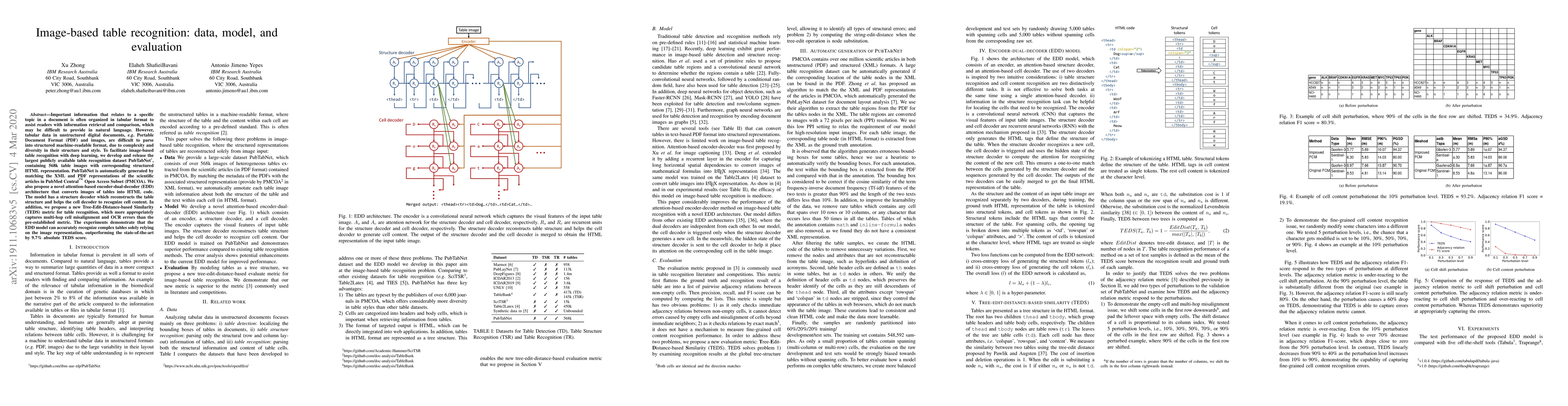 This paper introduces PubTabNet, a large dataset for image-based table recognition, and proposes an attention-based encoder-dual-decoder (EDD) model to convert table images into structured HTML. The EDD model outperforms existing methods by 9.7% in the new Tree-Edit-Distance-based Similarity (TEDS) metric.