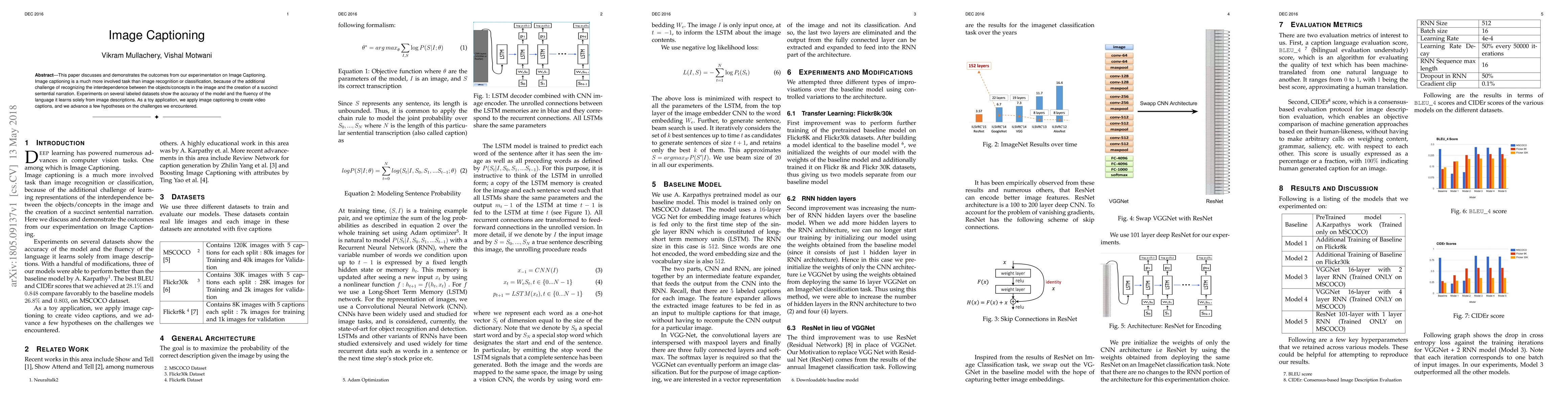This paper discusses and demonstrates the outcomes from our experimentation on Image Captioning. Image captioning is a much more involved task than image recognition or classification, because of the additional challenge of recognizing the interdependence between the objects/concepts in the image and the creation of a succinct sentential narration. Experiments on several labeled datasets show the accuracy of the model and the fluency of the language it learns solely from image descriptions. As a toy application, we apply image captioning to create video captions, and we advance a few hypotheses on the challenges we encountered.