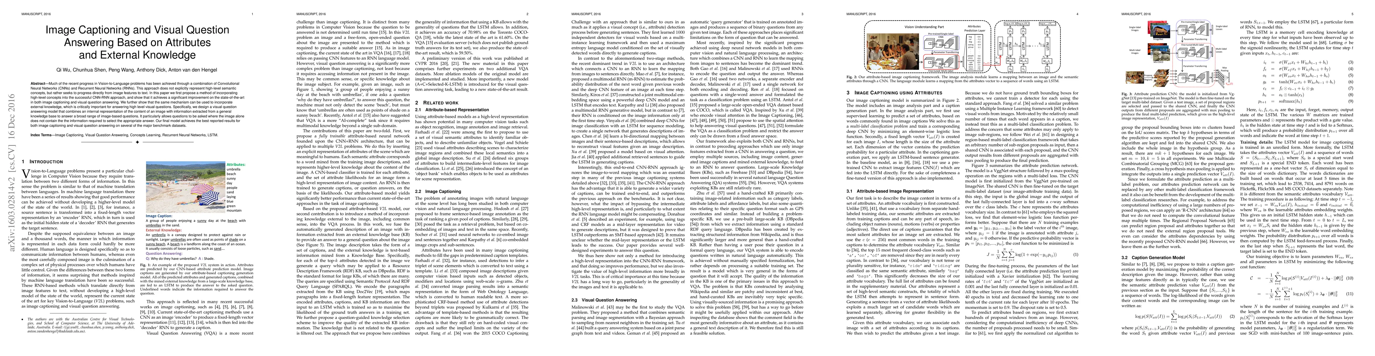 Much recent progress in Vision-to-Language problems has been achieved through a combination of Convolutional Neural Networks (CNNs) and Recurrent Neural Networks (RNNs). This approach does not explicitly represent high-level semantic concepts, but rather seeks to progress directly from image features to text. In this paper we first propose a method of incorporating high-level concepts into the successful CNN-RNN approach, and show that it achieves a significant improvement on the state-of-the-art in both image captioning and visual question answering. We further show that the same mechanism can be used to incorporate external knowledge, which is critically important for answering high level visual questions. Specifically, we design a visual question answering model that combines an internal representation of the content of an image with information extracted from a general knowledge base to answer a broad range of image-based questions. It particularly allows questions to be asked about the contents of an image, even when the image itself does not contain a complete answer. Our final model achieves the best reported results on both image captioning and visual question answering on several benchmark datasets.