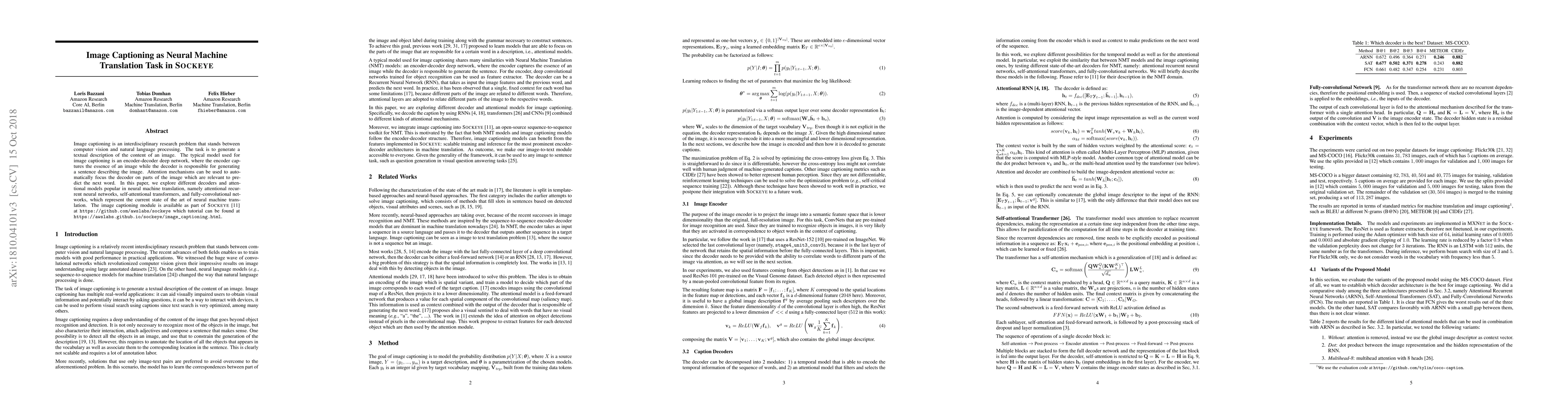 Image captioning is an interdisciplinary research problem that stands between computer vision and natural language processing. The task is to generate a textual description of the content of an image. The typical model used for image captioning is an encoder-decoder deep network, where the encoder captures the essence of an image while the decoder is responsible for generating a sentence describing the image. Attention mechanisms can be used to automatically focus the decoder on parts of the image which are relevant to predict the next word. In this paper, we explore different decoders and attentional models popular in neural machine translation, namely attentional recurrent neural networks, self-attentional transformers, and fully-convolutional networks, which represent the current state of the art of neural machine translation. The image captioning module is available as part of SOCKEYE at https://github.com/awslabs/sockeye which tutorial can be found at https://awslabs.github.io/sockeye/image_captioning.html .