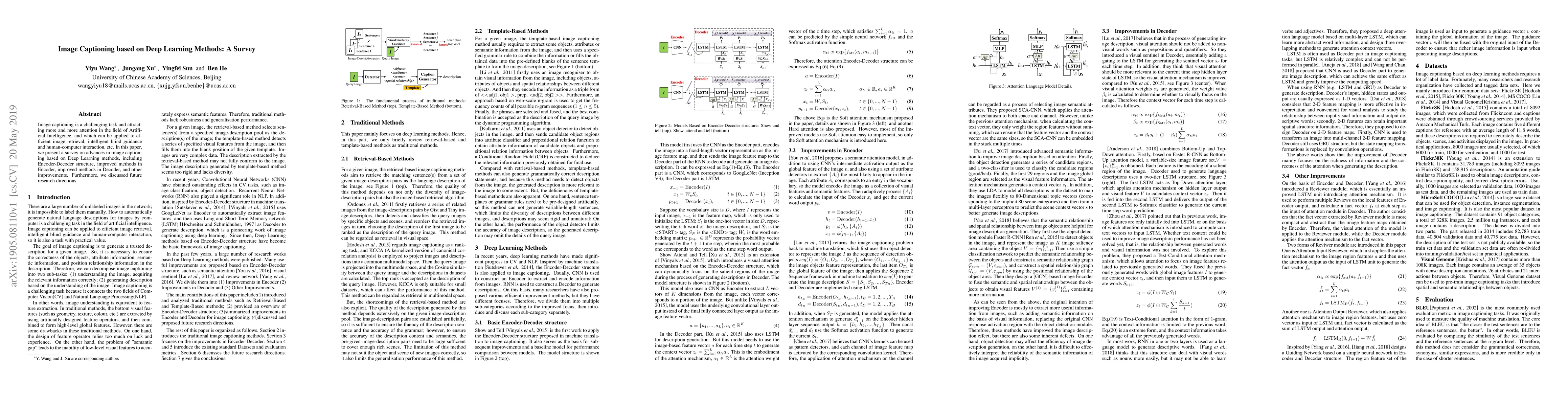This paper surveys recent advances in deep learning methods for image captioning, focusing on the Encoder-Decoder framework and enhancements in both Encoder and Decoder components, while also discussing potential future research directions.