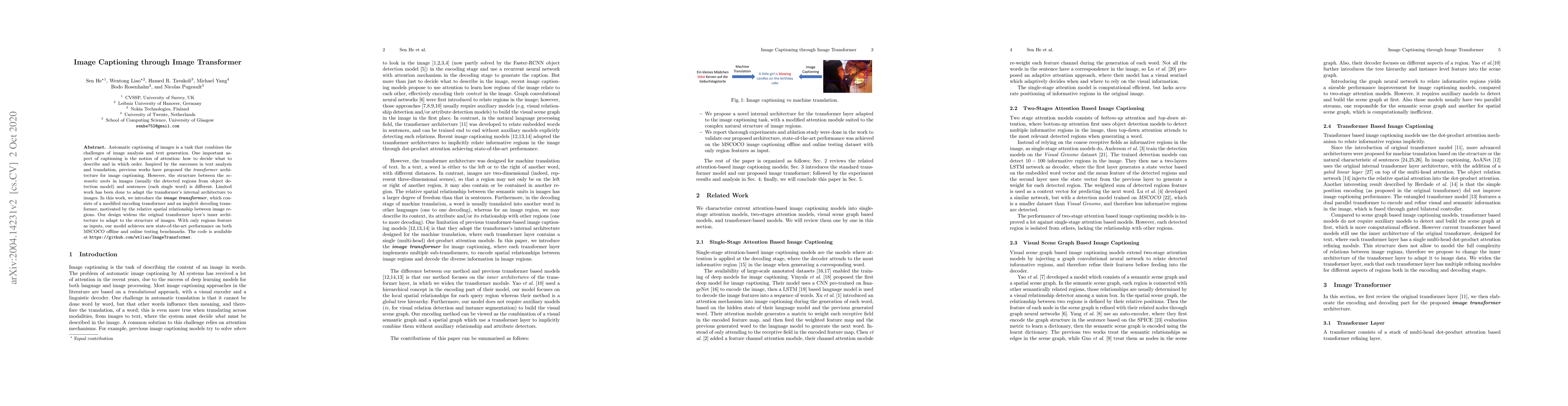 This paper proposes an "image transformer" for automatic image captioning, adapting the transformer architecture to better handle the spatial relationships between image regions. The model achieves state-of-the-art performance on MSCOCO benchmarks by modifying the transformer's encoding and decoding components to fit image structure.