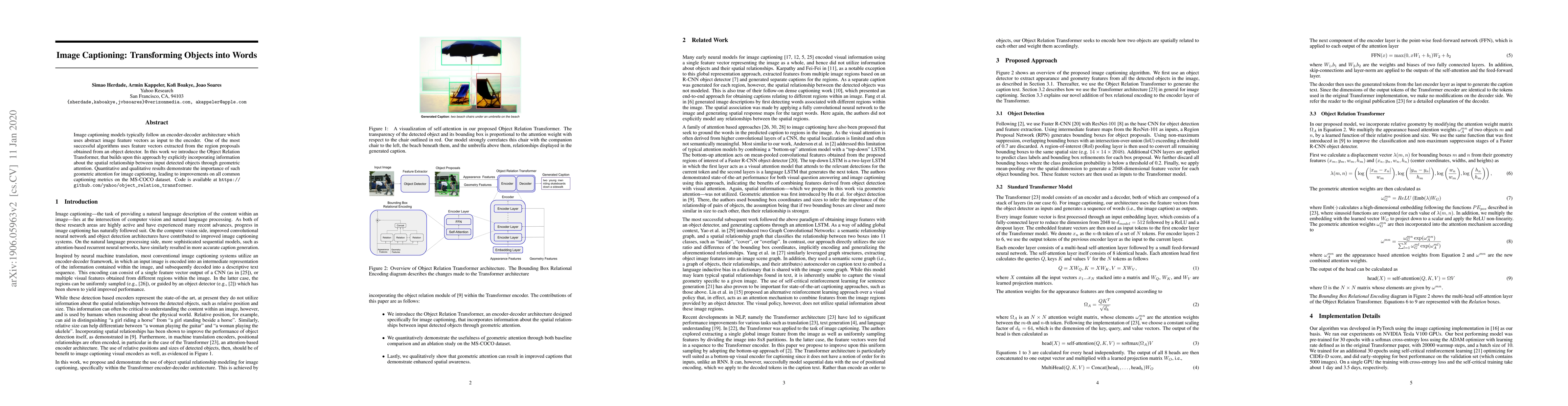 Image captioning models typically follow an encoder-decoder architecture which uses abstract image feature vectors as input to the encoder. One of the most successful algorithms uses feature vectors extracted from the region proposals obtained from an object detector. In this work we introduce the Object Relation Transformer, that builds upon this approach by explicitly incorporating information about the spatial relationship between input detected objects through geometric attention. Quantitative and qualitative results demonstrate the importance of such geometric attention for image captioning, leading to improvements on all common captioning metrics on the MS-COCO dataset.
