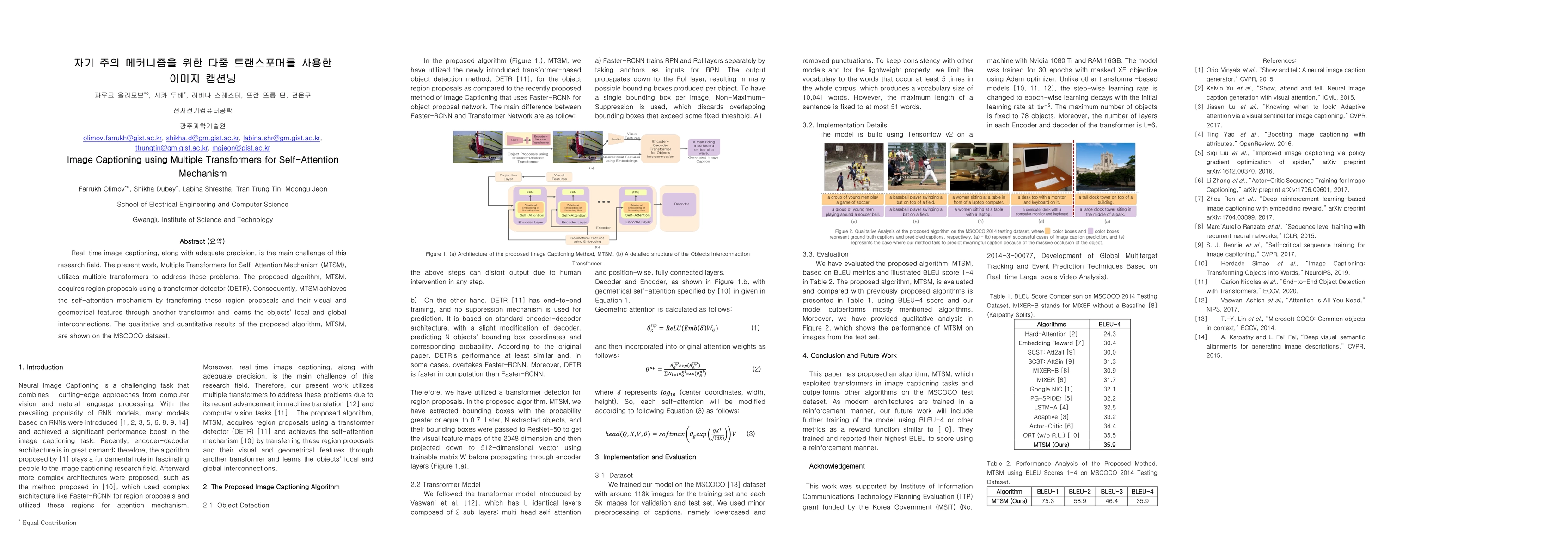 This paper proposes Multiple Transformers for Self-Attention Mechanism (MTSM) to enhance real-time image captioning precision. MTSM uses a transformer detector to generate region proposals and another transformer to learn local and global interconnections of objects, achieving improved results on the MSCOCO dataset.