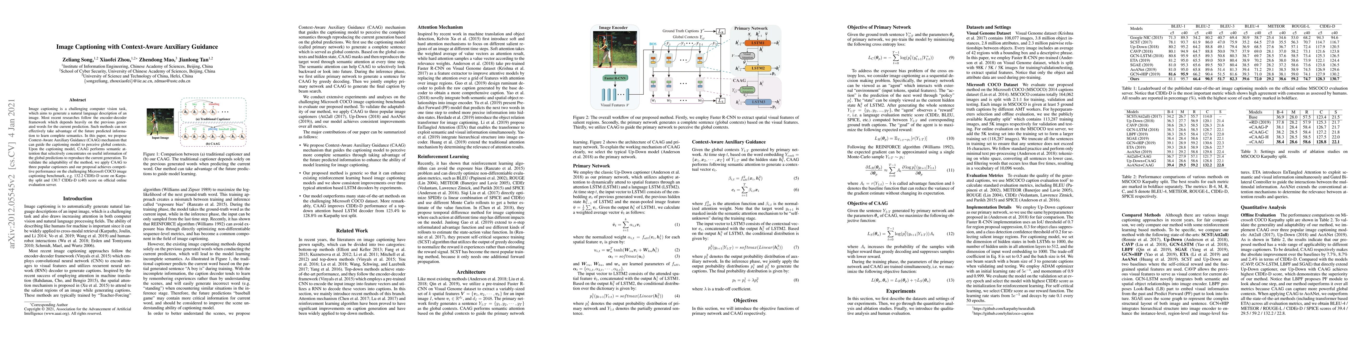 This paper proposes a Context-Aware Auxiliary Guidance (CAAG) mechanism to enhance image captioning models by incorporating global context through semantic attention. The method achieves competitive performance on the Microsoft COCO benchmark, demonstrating its effectiveness.