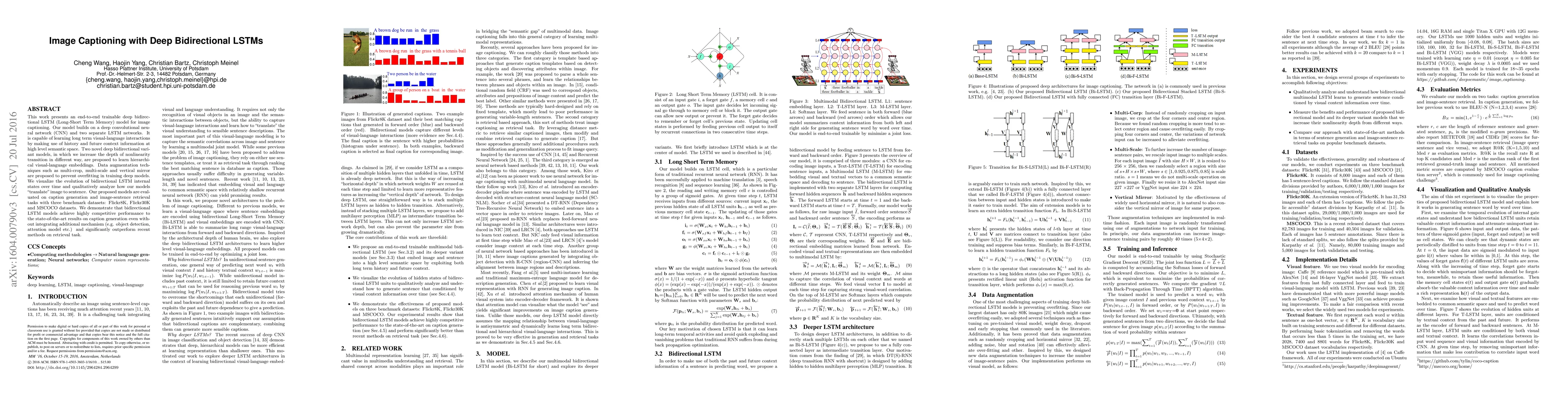 A deep bidirectional LSTM model achieves competitive performance in image captioning without additional mechanisms, outperforming recent methods on retrieval tasks. The model learns hierarchical visual-language embeddings using data augmentation techniques.
