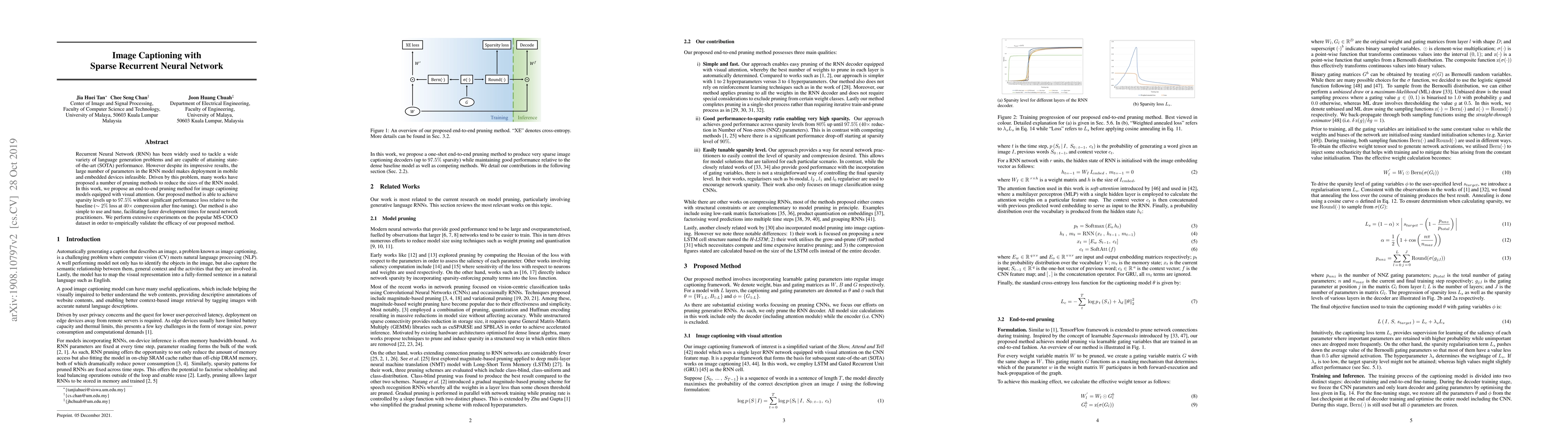 This paper proposes an end-to-end pruning method for sparse Recurrent Neural Networks (RNN) in image captioning, achieving up to 97.5% sparsity with minimal performance loss (~2% after fine-tuning). The method facilitates faster development and is validated on the MS-COCO dataset.