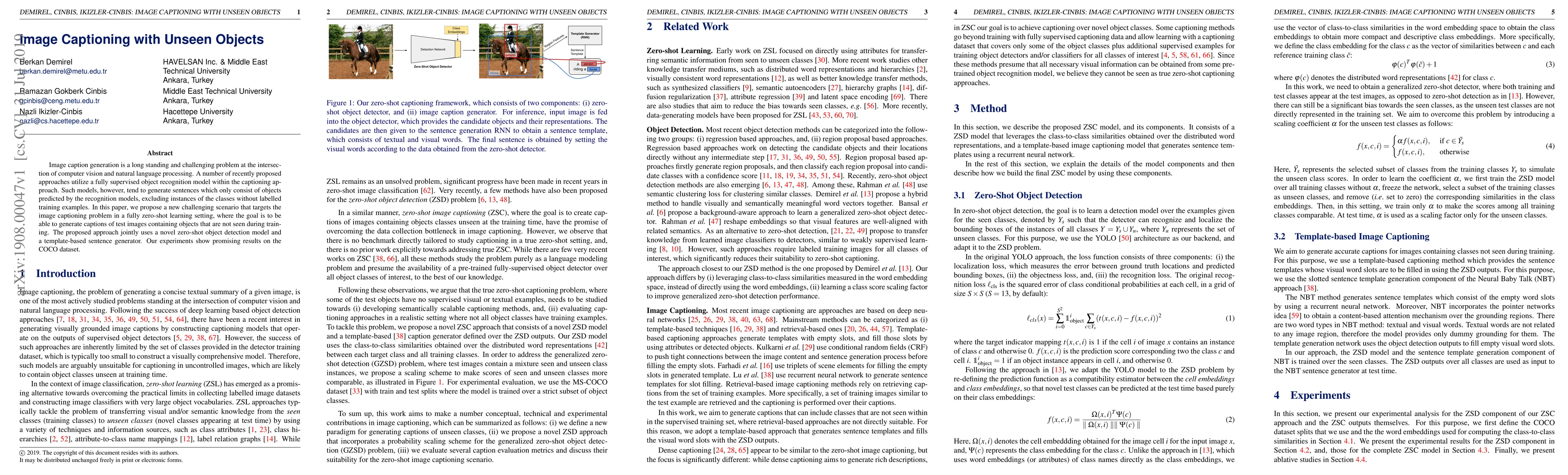 Image caption generation is a long standing and challenging problem at the intersection of computer vision and natural language processing. A number of recently proposed approaches utilize a fully supervised object recognition model within the captioning approach. Such models, however, tend to generate sentences which only consist of objects predicted by the recognition models, excluding instances of the classes without labelled training examples. In this paper, we propose a new challenging scenario that targets the image captioning problem in a fully zero-shot learning setting, where the goal is to be able to generate captions of test images containing objects that are not seen during training. The proposed approach jointly uses a novel zero-shot object detection model and a template-based sentence generator. Our experiments show promising results on the COCO dataset.