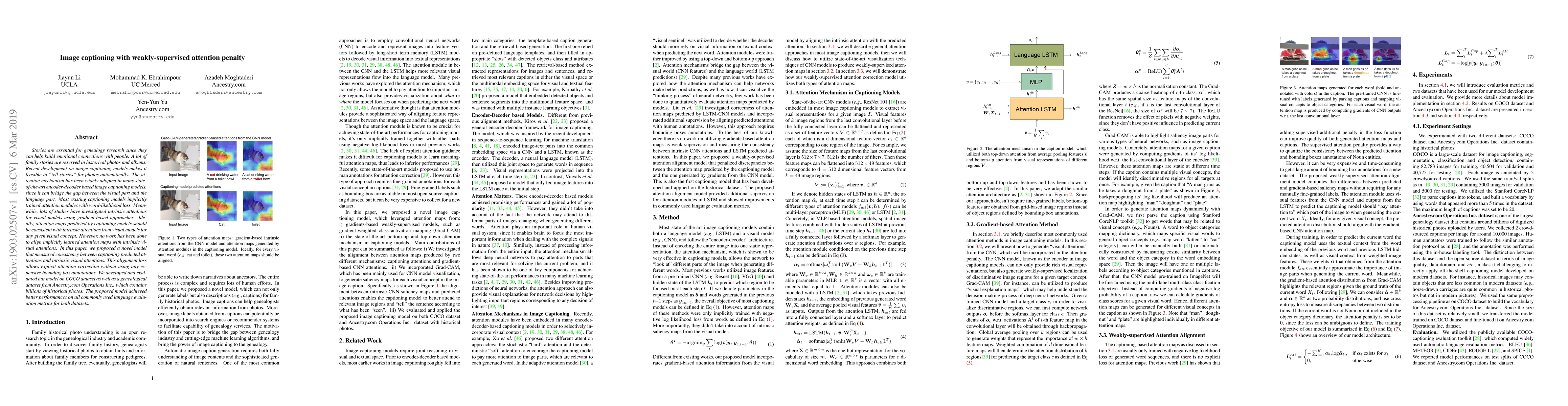 This paper proposes a novel image captioning model that incorporates an attention penalty loss to align predicted attention maps with intrinsic visual attentions, enhancing the model's consistency without requiring bounding box annotations. The model demonstrates improved performance on language evaluation metrics across both COCO and a genealogical dataset from Ancestry.com.