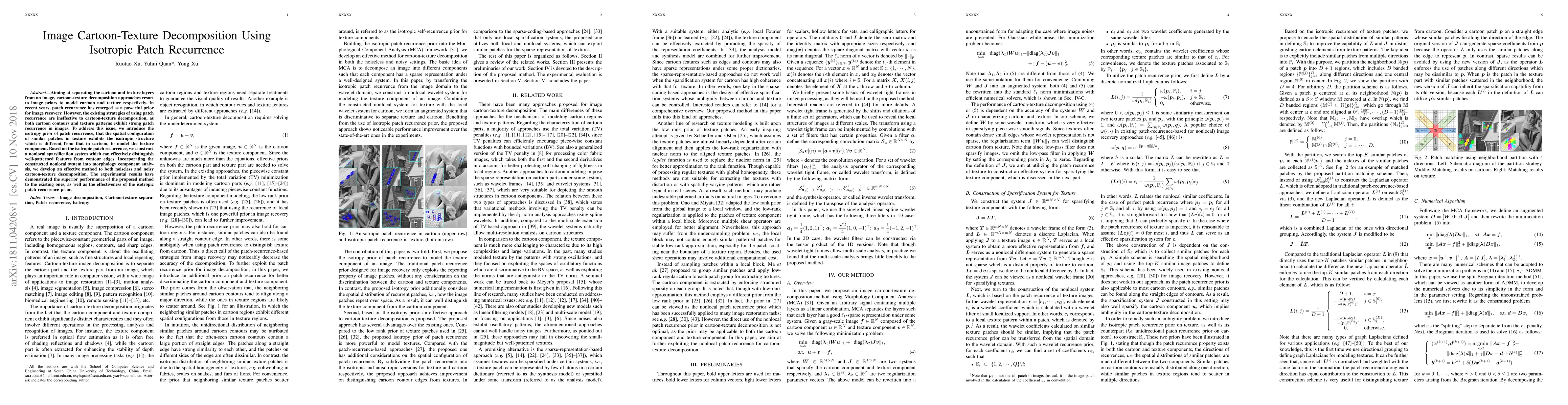 This paper proposes a method for cartoon-texture decomposition using an isotropy prior of patch recurrence to distinguish texture patterns from cartoon contours. The method constructs a nonlocal sparsification system based on the isotropic structure of texture patches, achieving superior performance over existing methods.