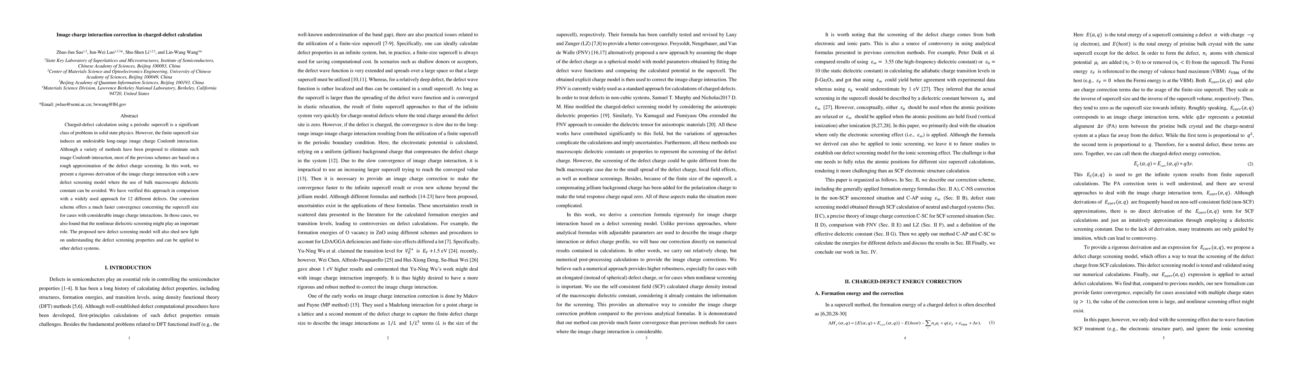 Charged-defect calculation using a periodic supercell is a significant class of problems in solid state physics. However, the finite supercell size induces an undesirable long-range image charge Coulomb interaction. Although a variety of methods have been proposed to eliminate such image Coulomb interaction, most of the previous schemes are based on a rough approximation of the defect charge screening. In this work, we present a rigorous derivation of the image charge interaction with a new defect screening model where the use of bulk macroscopic dielectric constant can be avoided. We have verified this approach in comparison with a widely used approach for 12 different defects. Our correction scheme offers a much faster convergence concerning the supercell size for cases with considerable image charge interactions. In those cases, we also found that the nonlinear dielectric screening might play an important role. The proposed new defect screening model will also shed new light on understanding the defect screening properties and can be applied to other defect systems.