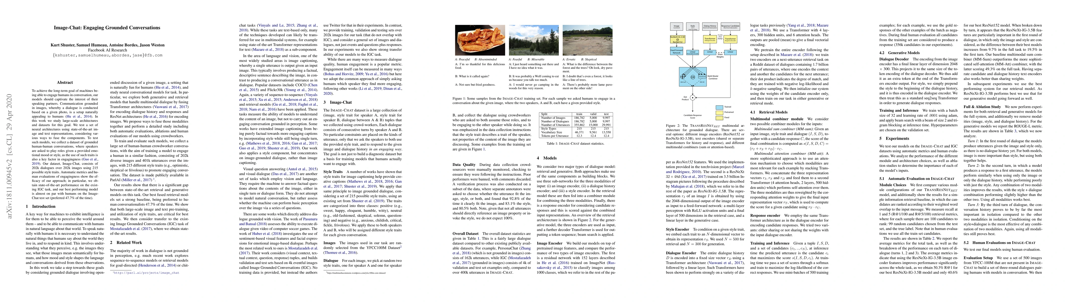 This paper explores neural architectures for grounded image-based conversations, testing various fusion methods using state-of-the-art representations. The authors introduce the Image-Chat dataset, comprising 202k dialogues based on 202k images with 215 style traits, and demonstrate state-of-the-art performance in engagingness metrics.
