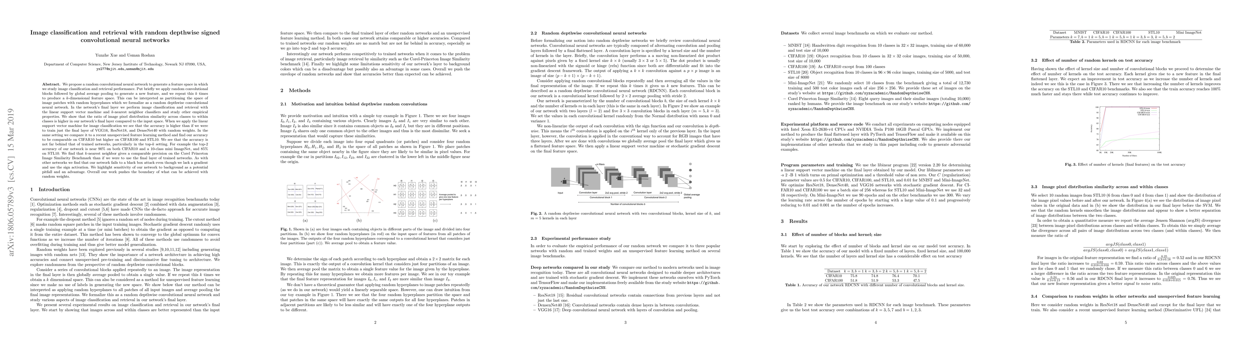 This paper proposes a new neural network architecture that achieves high accuracy in image classification and retrieval tasks using random convolutional blocks, outperforming trained networks in some cases.