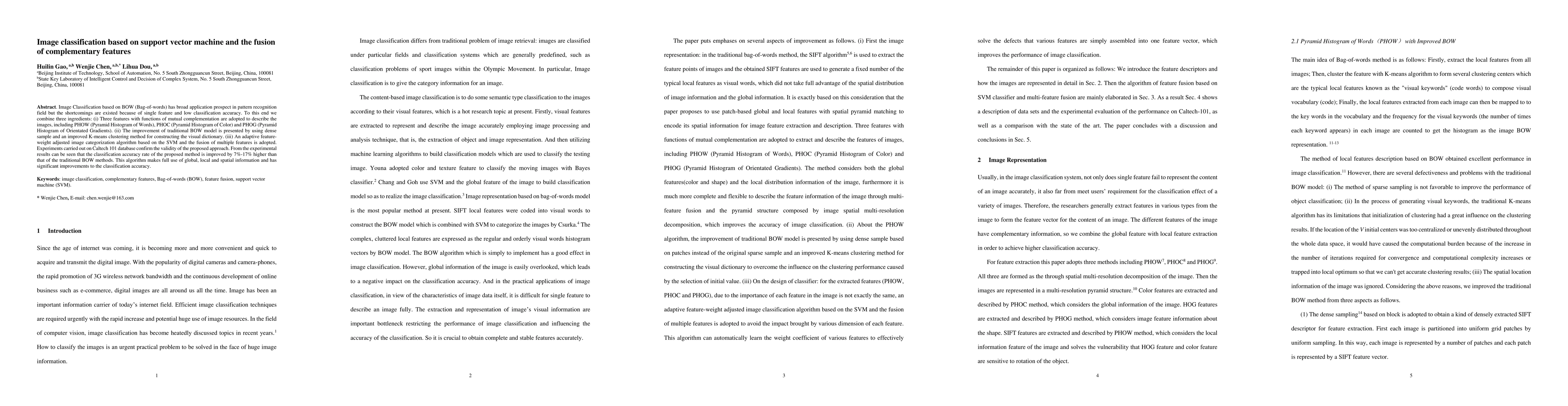 This paper proposes an image classification method using SVM and complementary feature fusion, combining PHOW, PHOC, and PHOG to enhance accuracy. The approach improves traditional BOW with dense samples and an enhanced K-means clustering, achieving a 7%-17% higher classification accuracy on the Caltech 101 dataset.