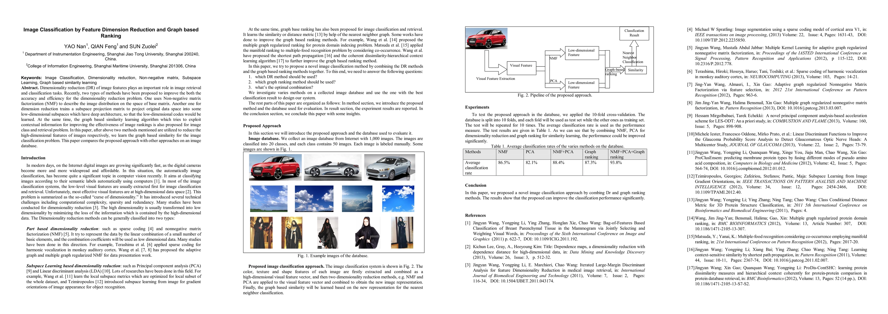 This paper proposes a method combining dimensionality reduction techniques and graph-based ranking for image classification. It utilizes Non-negative matrix factorization and subspace projection for feature reduction, followed by graph-based similarity learning to enhance classification accuracy. The approach is evaluated against other methods on an image database.