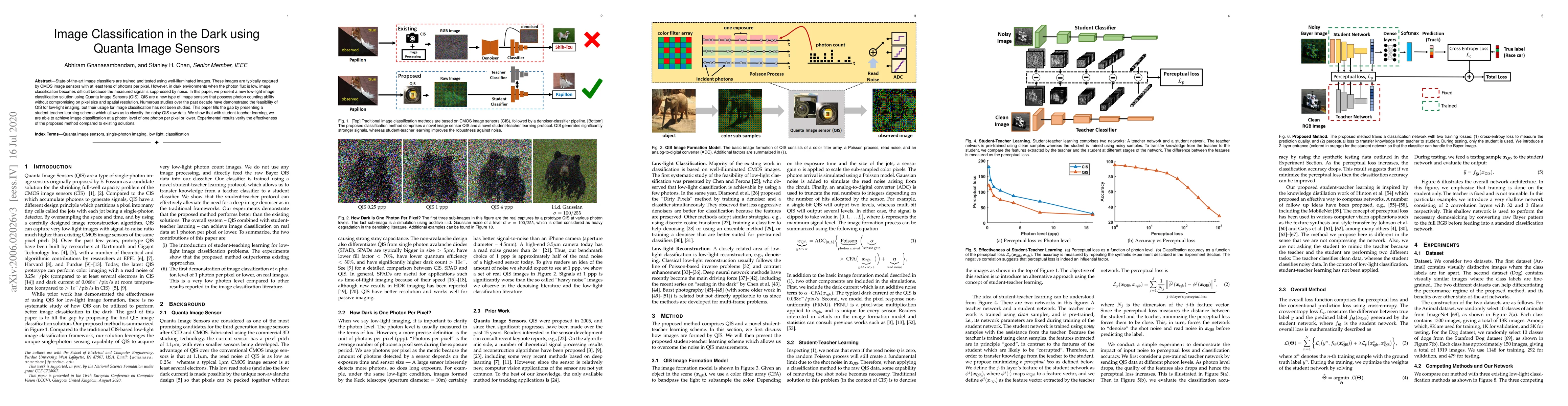 This paper introduces a novel low-light image classification method using Quanta Image Sensors (QIS), which enable photon counting without sacrificing resolution. The proposed student-teacher learning scheme effectively classifies noisy QIS data, achieving classification at one photon per pixel or lower, outperforming existing solutions.