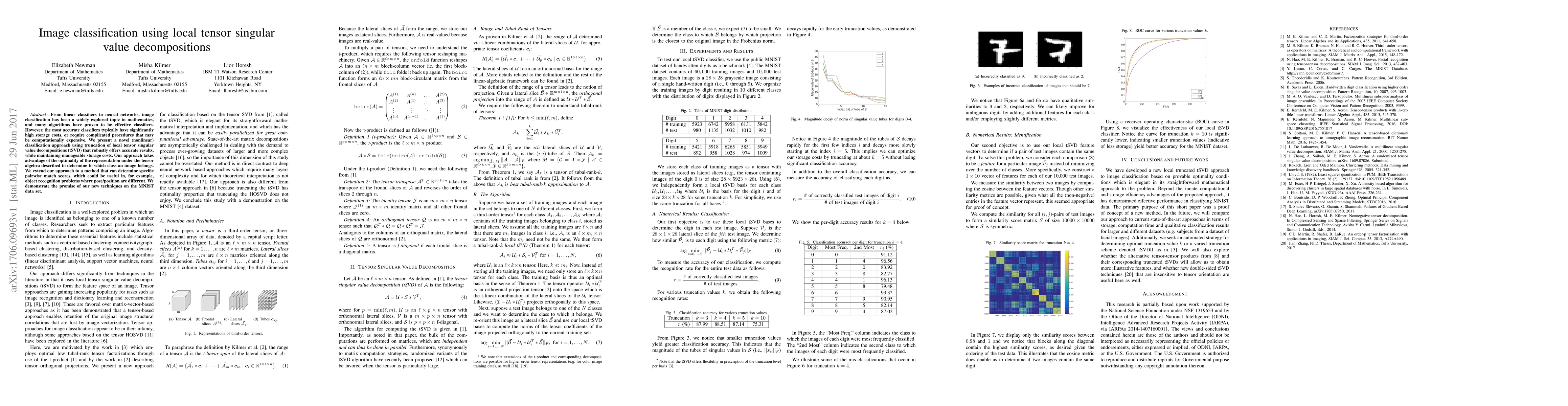 This paper proposes a novel nonlinear image classification method using truncated local tensor singular value decompositions (tSVD) that balances accuracy with manageable storage costs. The method is demonstrated to be effective on the MNIST dataset and can also compute pairwise match scores for applications like object recognition.
