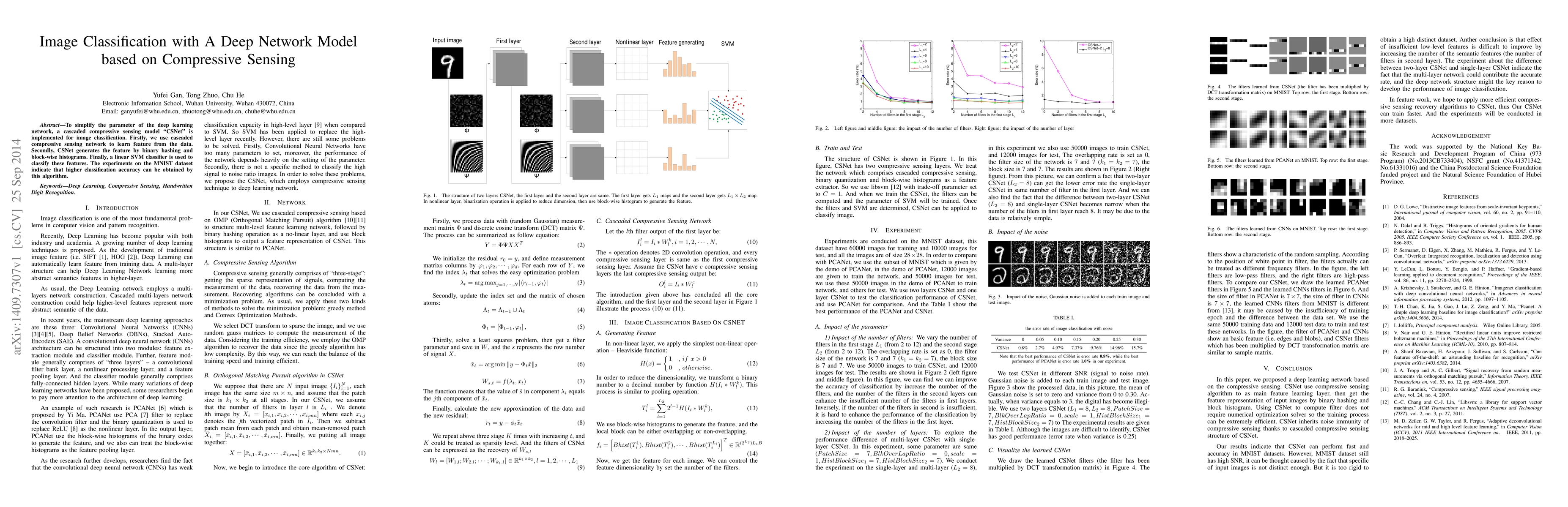 This paper proposes a "CSNet" model using cascaded compressive sensing for image classification, which simplifies deep learning parameters. The model employs binary hashing and block-wise histograms to generate features, followed by a linear SVM classifier, achieving high accuracy on the MNIST dataset.