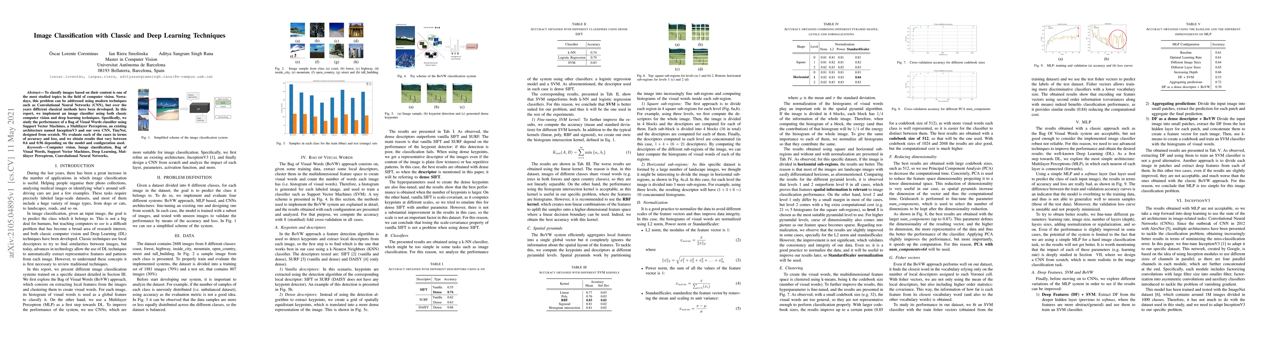 To classify images based on their content is one of the most studied topics in the field of computer vision. Nowadays, this problem can be addressed using modern techniques such as Convolutional Neural Networks (CNN), but over the years different classical methods have been developed. In this report, we implement an image classifier using both classic computer vision and deep learning techniques. Specifically, we study the performance of a Bag of Visual Words classifier using Support Vector Machines, a Multilayer Perceptron, an existing architecture named InceptionV3 and our own CNN, TinyNet, designed from scratch. We evaluate each of the cases in terms of accuracy and loss, and we obtain results that vary between 0.6 and 0.96 depending on the model and configuration used.