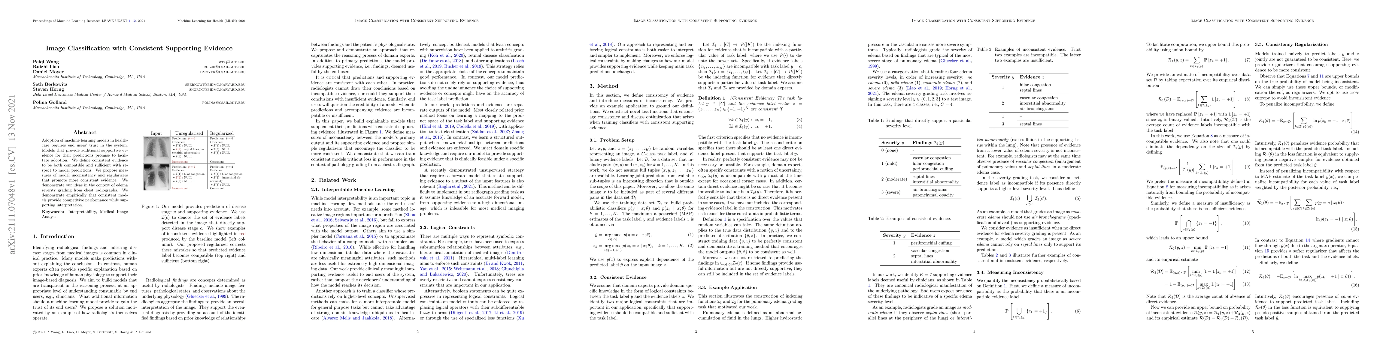 Adoption of machine learning models in healthcare requires end users' trust in the system. Models that provide additional supportive evidence for their predictions promise to facilitate adoption. We define consistent evidence to be both compatible and sufficient with respect to model predictions. We propose measures of model inconsistency and regularizers that promote more consistent evidence. We demonstrate our ideas in the context of edema severity grading from chest radiographs. We demonstrate empirically that consistent models provide competitive performance while supporting interpretation.