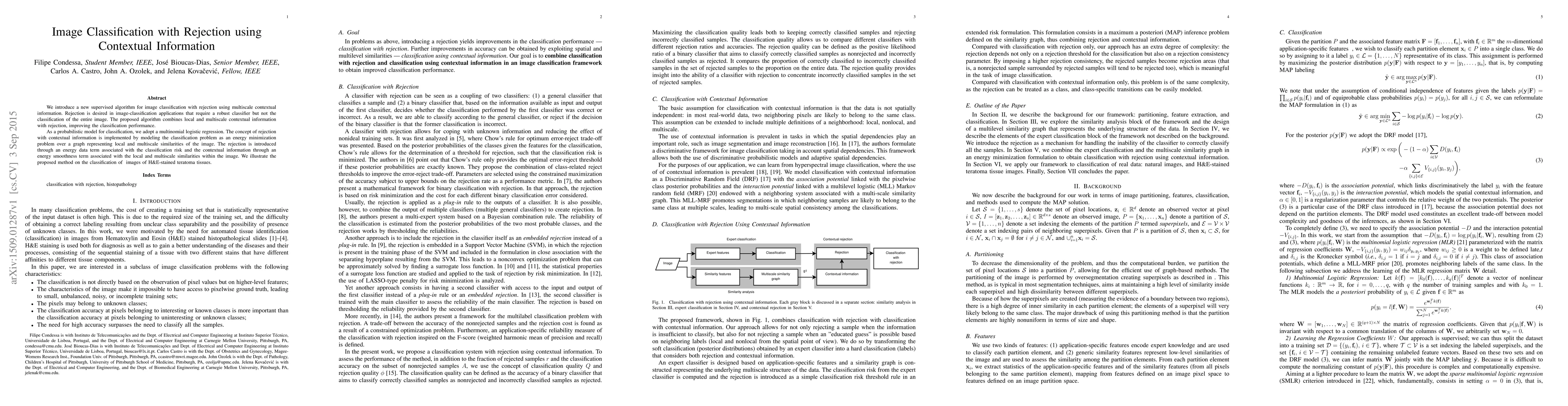 This paper proposes a supervised algorithm for image classification with rejection, utilizing multiscale contextual information and a multinomial logistic regression model. The method enhances classification performance by incorporating local and multiscale contextual information, and it demonstrates effectiveness in classifying H&E-stained teratoma tissues.