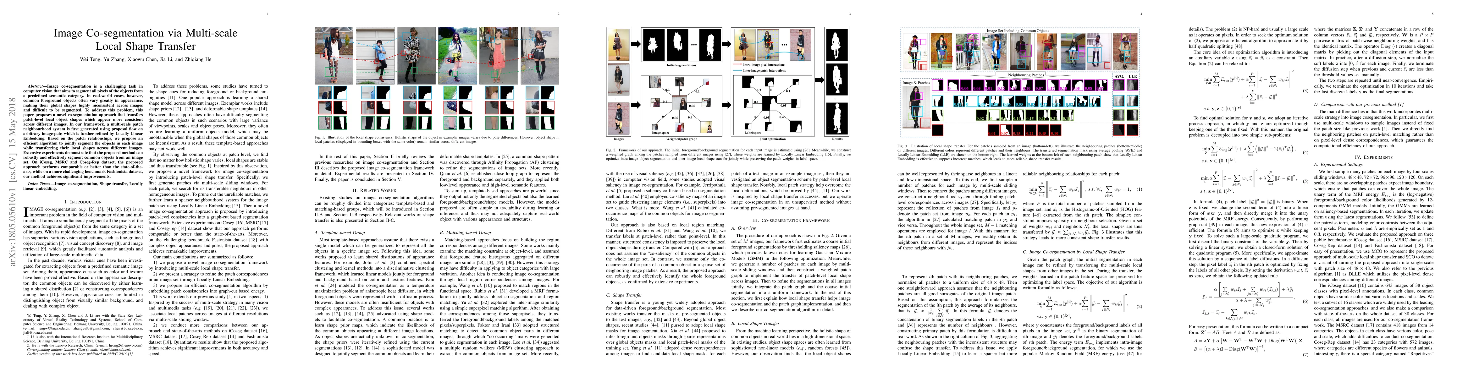 This paper introduces a novel co-segmentation method that leverages multi-scale local shape transfer to segment common objects across images despite significant appearance variations. The approach uses a multi-scale patch neighborhood system refined by Locally Linear Embedding to transfer consistent local shapes, achieving robust performance on various datasets.