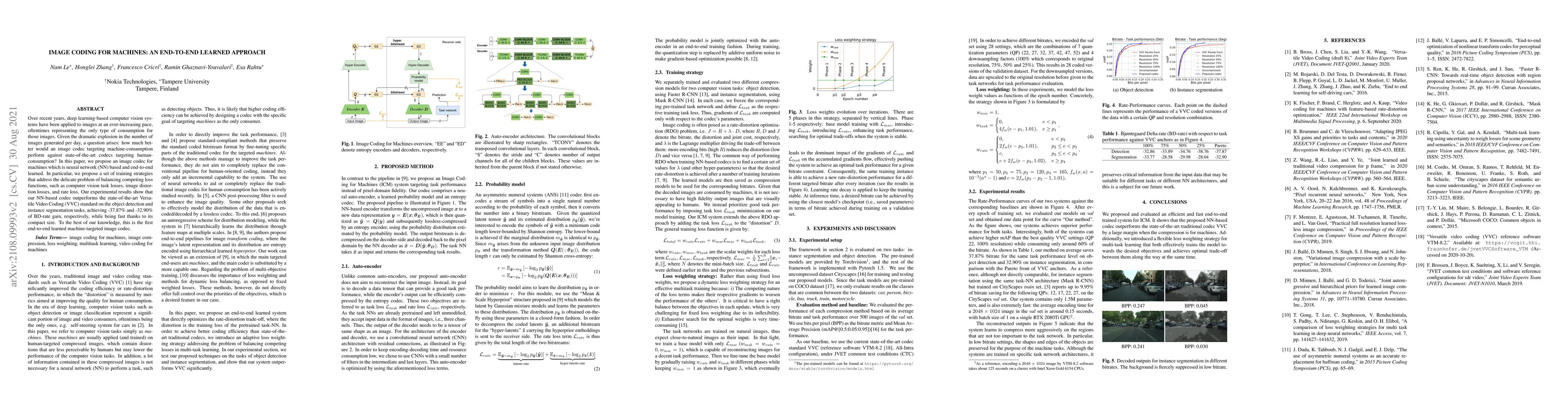 Over recent years, deep learning-based computer vision systems have been applied to images at an ever-increasing pace, oftentimes representing the only type of consumption for those images. Given the dramatic explosion in the number of images generated per day, a question arises: how much better would an image codec targeting machine-consumption perform against state-of-the-art codecs targeting human-consumption? In this paper, we propose an image codec for machines which is neural network (NN) based and end-to-end learned. In particular, we propose a set of training strategies that address the delicate problem of balancing competing loss functions, such as computer vision task losses, image distortion losses, and rate loss. Our experimental results show that our NN-based codec outperforms the state-of-the-art Versa-tile Video Coding (VVC) standard on the object detection and instance segmentation tasks, achieving -37.87% and -32.90% of BD-rate gain, respectively, while being fast thanks to its compact size. To the best of our knowledge, this is the first end-to-end learned machine-targeted image codec.
