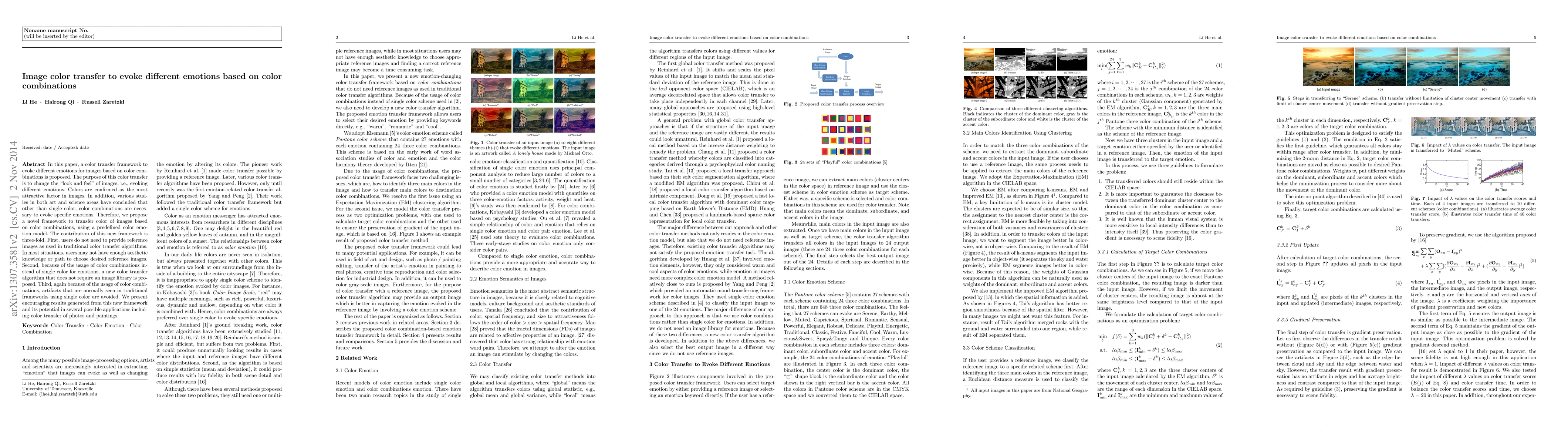 This paper proposes a novel color transfer framework that uses predefined color combinations to evoke specific emotions in images, eliminating the need for reference images or an image library, and avoiding artifacts from traditional single-color methods. The framework's potential applications include enhancing photos and paintings by altering their emotional impact.
