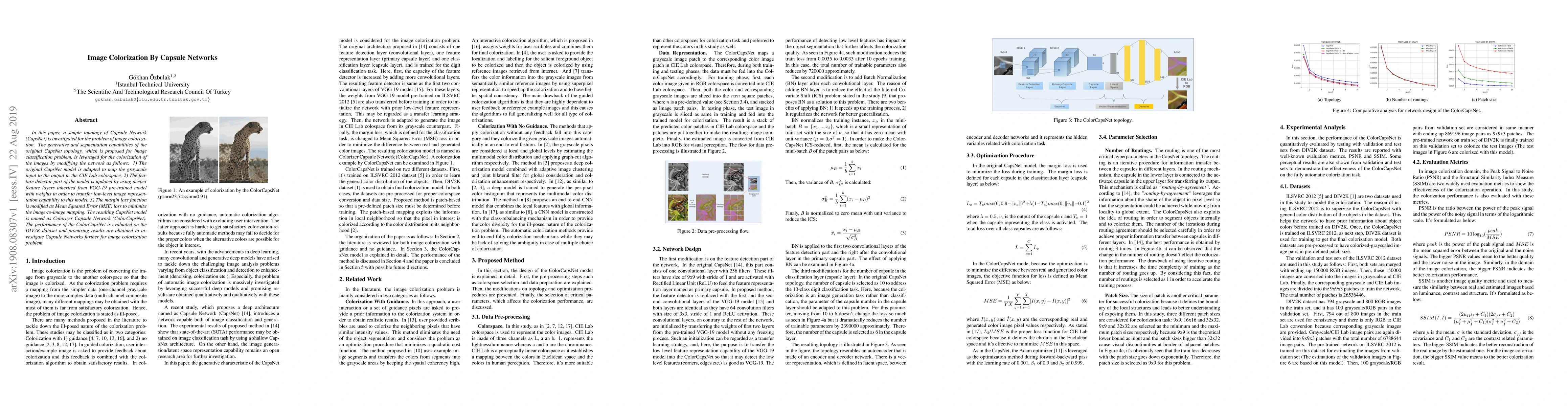 In this paper, a simple topology of Capsule Network (CapsNet) is investigated for the problem of image colorization. The generative and segmentation capabilities of the original CapsNet topology, which is proposed for image classification problem, is leveraged for the colorization of the images by modifying the network as follows:1) The original CapsNet model is adapted to map the grayscale input to the output in the CIE Lab colorspace, 2) The feature detector part of the model is updated by using deeper feature layers inherited from VGG-19 pre-trained model with weights in order to transfer low-level image representation capability to this model, 3) The margin loss function is modified as Mean Squared Error (MSE) loss to minimize the image-to-imagemapping. The resulting CapsNet model is named as Colorizer Capsule Network (ColorCapsNet).The performance of the ColorCapsNet is evaluated on the DIV2K dataset and promising results are obtained to investigate Capsule Networks further for image colorization problem.