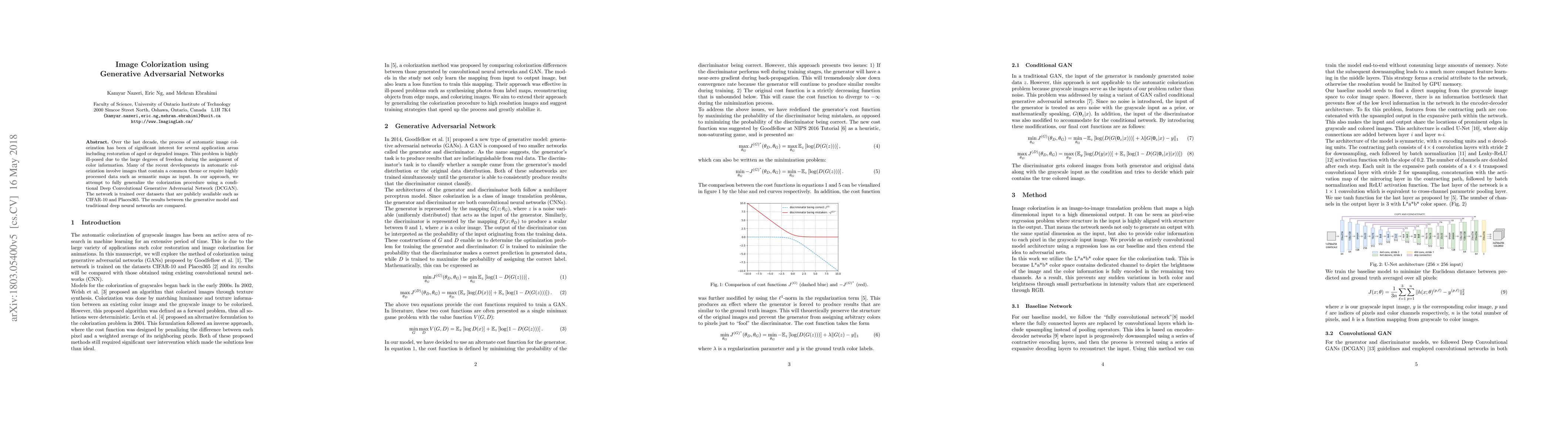 Over the last decade, the process of automatic image colorization has been of significant interest for several application areas including restoration of aged or degraded images. This problem is highly ill-posed due to the large degrees of freedom during the assignment of color information. Many of the recent developments in automatic colorization involve images that contain a common theme or require highly processed data such as semantic maps as input. In our approach, we attempt to fully generalize the colorization procedure using a conditional Deep Convolutional Generative Adversarial Network (DCGAN), extend current methods to high-resolution images and suggest training strategies that speed up the process and greatly stabilize it. The network is trained over datasets that are publicly available such as CIFAR-10 and Places365. The results of the generative model and traditional deep neural networks are compared.