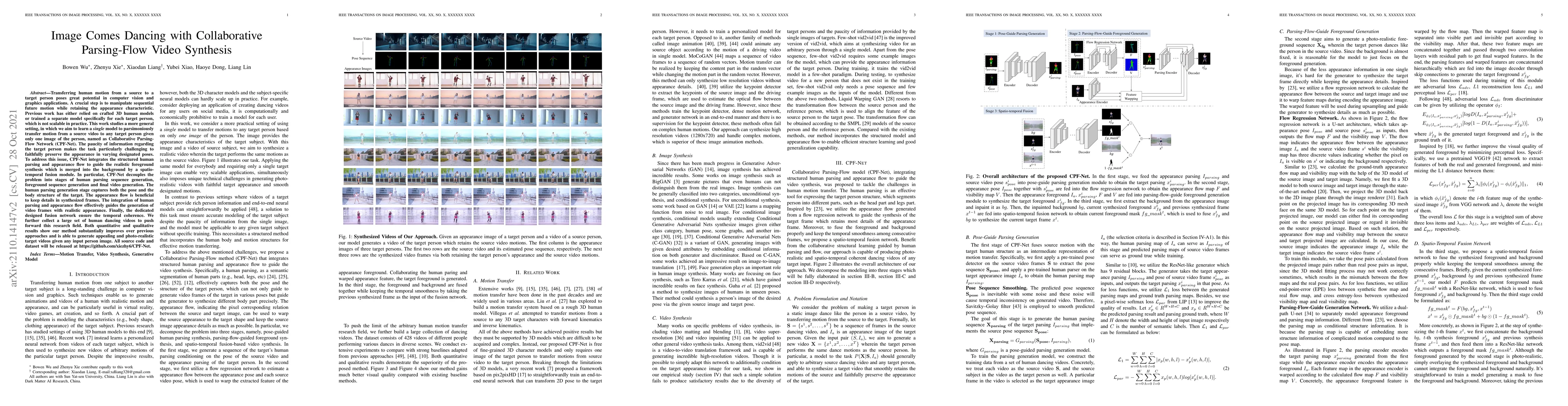 This paper introduces a Collaborative Parsing-Flow Network (CPF-Net) to transfer human motion from a source video to any target person using only one image of the target. The method integrates human parsing and appearance flow to generate realistic and coherent video frames, outperforming previous scalable approaches.