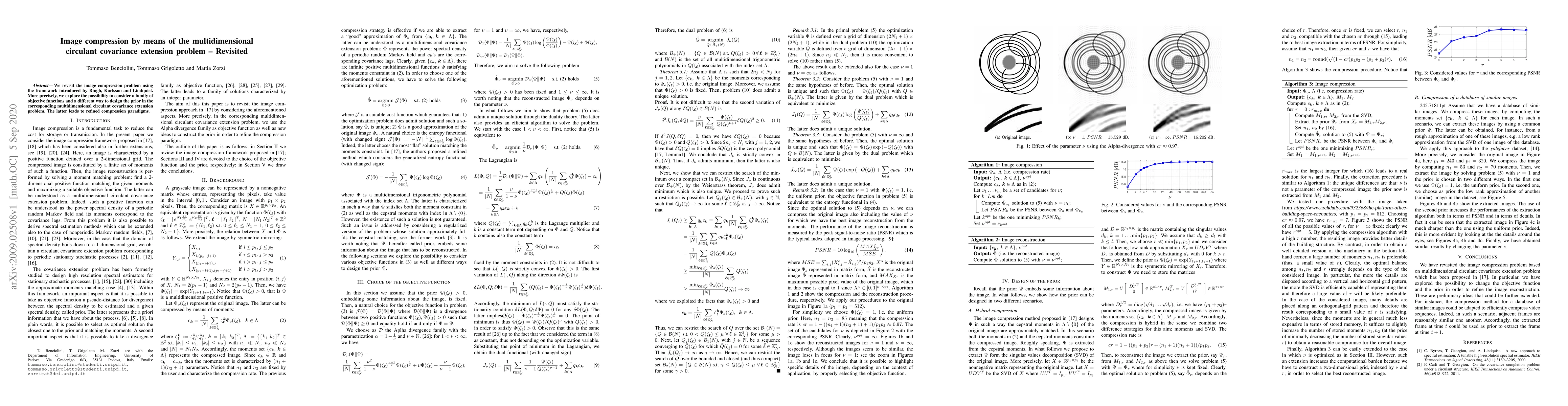 We revisit the image compression problem using the framework introduced by Ringh, Karlsson and Lindquist. More precisely, we explore the possibility to consider a family of objective functions and a different way to design the prior in the corresponding multidimensional circulant covariance extension problem. The latter leads to refined compression paradigms.