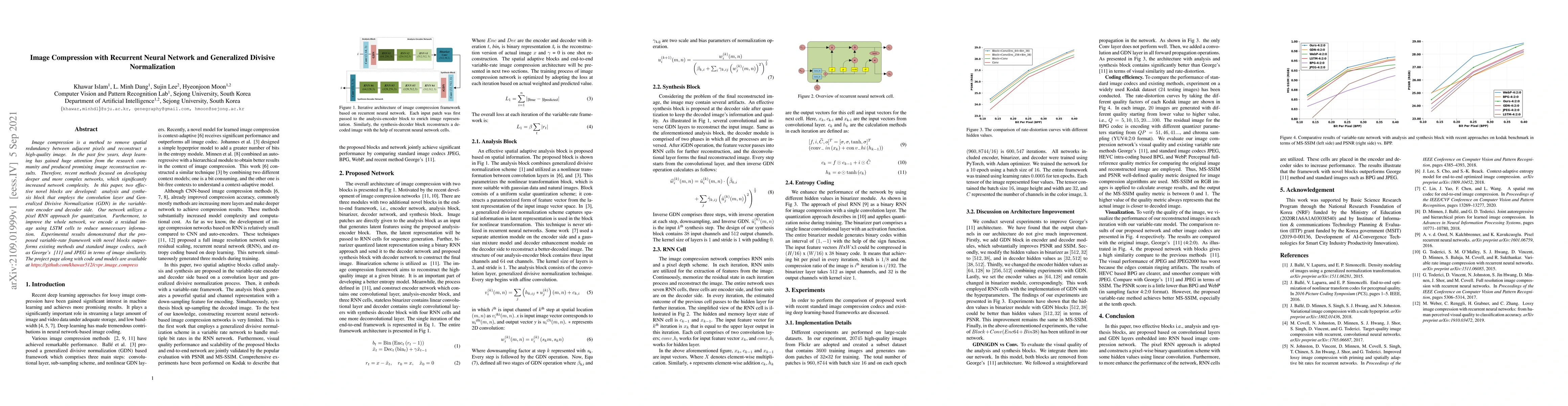 This paper proposes a novel image compression method using a recurrent neural network with Generalized Divisive Normalization and LSTM cells for residual encoding. The developed analysis and synthesis blocks outperform existing codecs in terms of image quality and compression efficiency.
